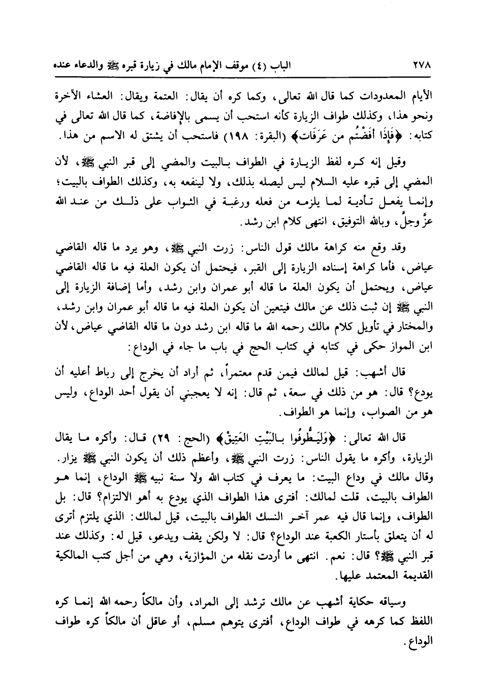 قال تعالى: {وَلْيَطَّوَّفُوا بِالْبَيْتِ الْعَتِيقِ} الحج 029) قال: وأكره ما يقال الزيارة، وأكره ما يقول الناس: زرت النبي صلى الله عليه وسلم وأعظم ذلك أن يكون النبي صلى الله عليه وسلم يزار وقال مالك في وداع البيت، ما يعرف في كتاب الله ولا سنة نبيه صلى الله عليه وسلم الوداع، إنما هو الطواف بالبيت، قلت لمالك، افترى هذا الطواف بالبيت، قيل لمالك: الذي يلتزم أترى له أن يتعلق بأستار الكعبة عند الوداع؟ قال: لا ولكن يقف ويدعو، قيل له: وكذلك عند قبر النبي صلى الله عليه وسلم؟ قال: نعم. انتهى ما أردت نقله من المؤازنة، وهي من أجل كتب المالكية القديمة المعتمد عليها.