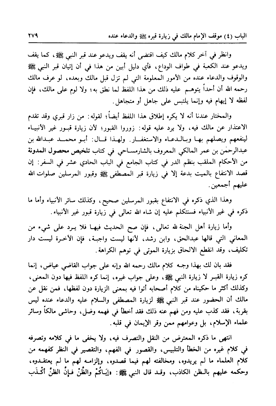 فقد بان لك بهذا وجه كلام مالك رحمه الله وإنه على جواب القاضي عياض، إنما كره زيارة القبر لا زيارة النبي صلى الله عليه وسلم وعلى جواب غيره، إنما كره اللفظ فيها دون المعنى، وكذلك أكثر ما حكيناه من كلام أصحابه أتوا فيه بمعنى الزيارة دون لفظها، فمن نقل عن مالك أن الحضور عند قبر النبي صلى الله عليه وسلم لزيارة المصطفى والسلام عليه والدعاء عنده ليس بقربة، فقد كذب عليه ومن فهم عنه ذلك فقد أخطأ في فهمه وضل، وحاشى مالكاً وسائر علماء الإسلام، بل وعوامهم ممن وقر الإيمان في قلبه.