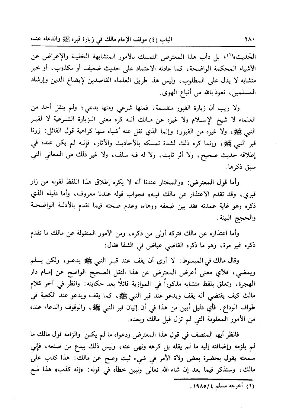 وقال مالك في المبسوط: لا أرى أن يقف عند قبر النبي صلى الله عليه وسلم يدعو، ولكن يسلم ويمضي،فلأي معنى أعرض المعترض عن هذا النقل الصحيح الواضع عن إمام دار الهجرة، وتعلق بلفظ متشابه مذكور في الموازنة قائلاً بعد حكايته، وانظر في آخر كلام مالك كيف يقتضي أنه يقف ويدعو عند قبر النبي صلى الله عليه وسلم كما يقف ويدعو عند الكعبة في طواف الوداع، فأي دليل أبين من هذا في أن إتيان قبر النبي صلى الله عليه وسلم، والوقوف والدعاء عنده من الأمور المعلومة التي لم تزل قبل مالك وبعده.