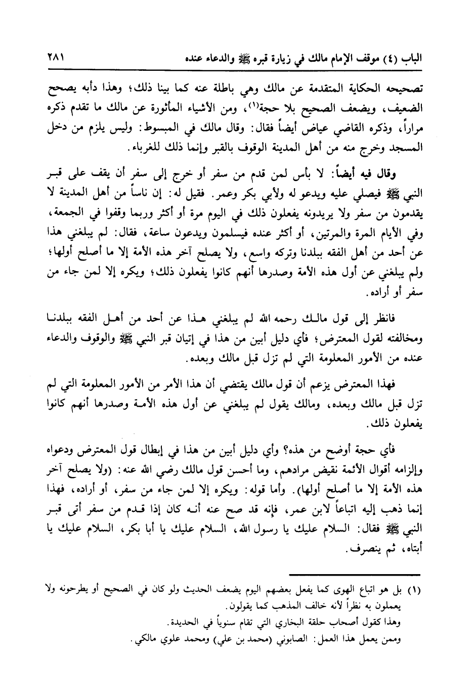 فانظر إلى قول مالك رحمه الله لم يبلغني هذا عن أحد من أهل الفقه ببلدنا ومخالفته لقول المعترض،فأي دليل أبين من هذا في إتيان قبر النبي صلى الله عليه وسلم والوقوف والدعاء عنده من الأمور المعلومة التي لم تزل قبل مالك وبعده.