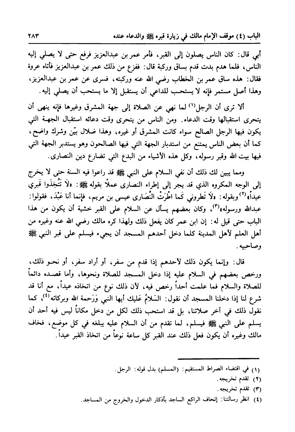 ومما يبين لك ذلك أن نفي السلام على النبي صلى الله عليه وسلم قد راعوا فيه السنة حتى لا يخرج إلى الوجه المكروه الذي قد يجر إلى إطراء النصارى عملاً بقوله صلى الله عليه وسلم: ((لا تتخذوا قبري عيداً)) (2) وبقوله: ((لا تطروني كما أطرت النصارى عيسى ابن مريم)) فإنما أنا عبد،فقولوا عبد الله ورسوله)) (3) وكان بعضهم يسأل عن السلام على القبر خشية أن يكون من هذا الباب حتى قيل له: إن ابن عمر كان يفعل ذلك ولهذا كره مالك رضي الله عنه وغيره من أهل العلم لأهل المدينة كلما دخل أحدهم المسجد أن يجيء فيسلم على قبر النبي صلى الله عليه وسلم وصاحبه.