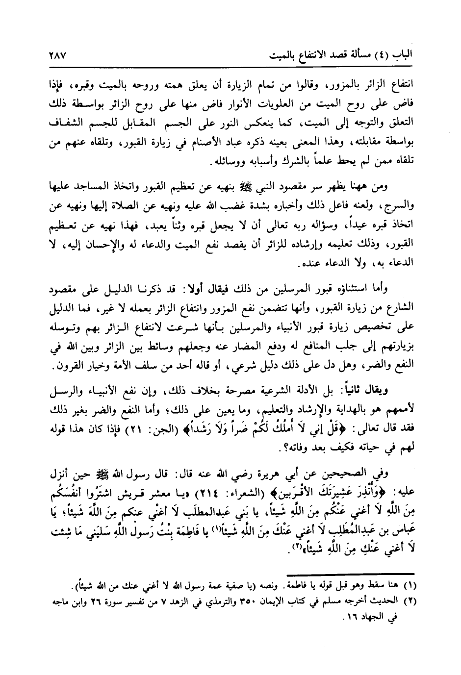ومن ههنا يظهر سر مقصود النبي صلى الله عليه وسلم بنهيه عن تعظيم القبور واتخاذ المساجد عليها والسرج، ولعنه فاعل ذلك وأخباره بشدة غضب الله عليه ونهيه عن الصلاة إليها ونهيه عن اتخاذ قبره عيداً، وسؤاله ربه تعالى أن لا يجعل قبره وثناً يعبد،فهذا نهيه عن تعظيم القبور، وذلك تعليمه وإرشاده للزائر أن يقصد نفع الميت والدعاء له والإحسان إليه، ولا الدعاء به، ولا الدعاء عنده.