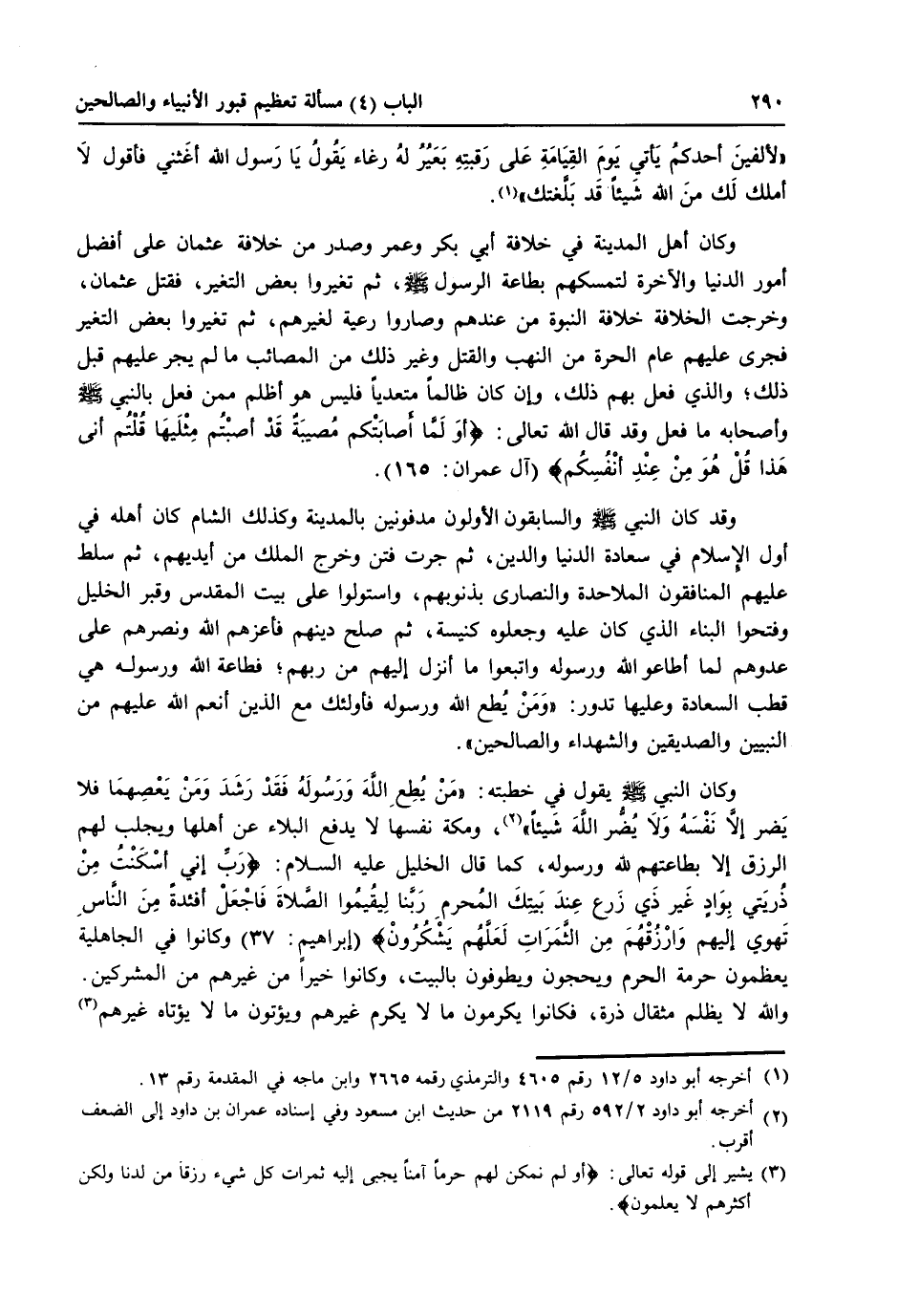 وقد كان النبي صلى الله عليه وسلم والسابقون الأولون مدفونين بالمدينة وكذلك الشام كان أهله في أول الإسلام في سعادة الدنيا والدين، ثم جرت فتن وخرج الملك من أيديهم، ثم سلط عليهم المنافقون الملاحدة والنصارى بذنوبهم، واستولوا على بيت المقدس وقبر الخليل وفتحو البناء الذي كان عليه وجعلوه كنيسة، ثم صلح دينهم فأعزلهم الله ونصرهم على عدوهم لما أطاعوا الله ورسوله، واتبعوا ما أنزل إليهم من ربهم، فطاعة الله ورسوله هي قطب السعادة وعليها تدور: ((ومن يطلع الله ورسوله فأولئك مع الذين أنعم الله عليهم من النبيين والصديقين والشهداء والصالحين)) .