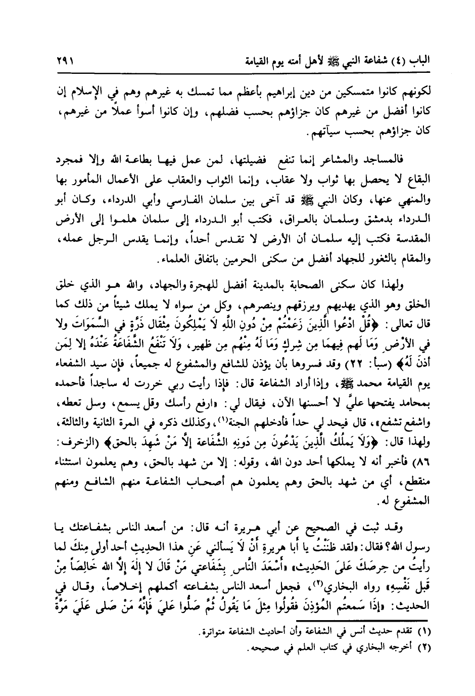 ولهذا كان سكنى الصحابة بالمدينة أفضل للهجرة والجهاد، والله هو الذي خلق الخلق وهو الذي يهديهم ويرزقهم وينصرهم، وكل من سواه لا يملك شيئاً من ذلك كما قال تعالى: {قُلِ ادْعُوا الَّذِينَ زَعَمْتُم مِّن دُونِ اللَّهِ لَا يَمْلِكُونَ مِثْقَالَ ذَرَّةٍ فِي السَّمَاوَاتِ وَلَا فِي الْأَرْضِ وَمَا لَهُمْ فِيهِمَا مِن شِرْكٍ وَمَا لَهُ مِنْهُم مِّن ظَهِيرٍ () وَلَا تَنفَعُ الشَّفَاعَةُ عِندَهُ إِلَّا لِمَنْ أَذِنَ لَهُ} (سبأ 022-023) وقد فسروها بأن يؤذن للشافع والمشفوع له جميعاً، فإن سيد الشفعاء يوم القيامة محمد صلى الله عليه وسلم، وإذا أراد الشفاعة قال: فإذا رأيت ربي خررت له ساجداً فأحمده بمحامد يفتحها علي لا أحسنها الآذن فيقال لي: ((ارفع رأسك وقل يسمع، وسل تعطه واشفع تشفع)) ، قال فيحد لي حداً فأدخلهم الجنة (1) ، وكذلك ذكره في المرة الثانية والثالثة ولهذا قال: {وَلَا يَمْلِكُ الَّذِينَ يَدْعُونَ مِن دُونِهِ الشَّفَاعَةَ إِلَّا مَن شَهِدَ بِالْحَقِّ} (الزخرف 086) فأخبر أنه لا يملكها أحد دون الله، وقوله: ((إلا من شهد بالحق)) وهم يعلمون استثناء منقطع، أي من شهد بالحق وهم يعلمون هم أصحاب الشفاعة منهم الشافع ومنهم المشفوع له.