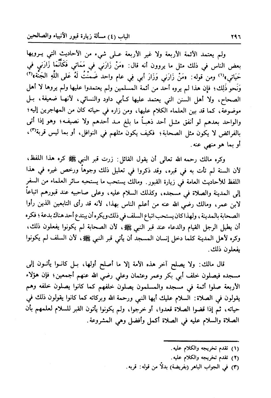وكره مالك رحمه الله تعالى أن يقول القائل: زرت قبر النبي صلى الله عليه وسلم كره هذا اللفظ، لأن السنة لم تأت به في قبره، وقد ذكروا في تعليل ذلك وجوهاً ورخص غيره في هذا اللفظ للأحاديث العامة في زيارة القبور، ومالك يتحسب ما يستحبه سائر العلماء من السفر إلى المدينة والصلاة في مسجده، وكذلك السلام عليه،وعلى صاحبيه عند قبورهم اتباعاً لابن عمر، ومالك رضي الله عنه من أعلم الناس بهذا، لأنه قد رأى التابعين الذين رأوا الصحابة بالمدينة، ولهذا كان يستحب اتباع السلف في ذلك ويكره أن يبتدع أحد هناك بدعة، فكره أن يطيل الرجل القيام والدعاء عند قبر النبي صلى الله عليه وسلم، لأن الصحابة لم يكونوا يفعلون ذلك وكره لأهل المدينة كما دخل إنسان المسجد أن يأتي قبر النبي صلى الله عليه وسلم، لأن السلف لم يكونوا يفعلون ذلك.