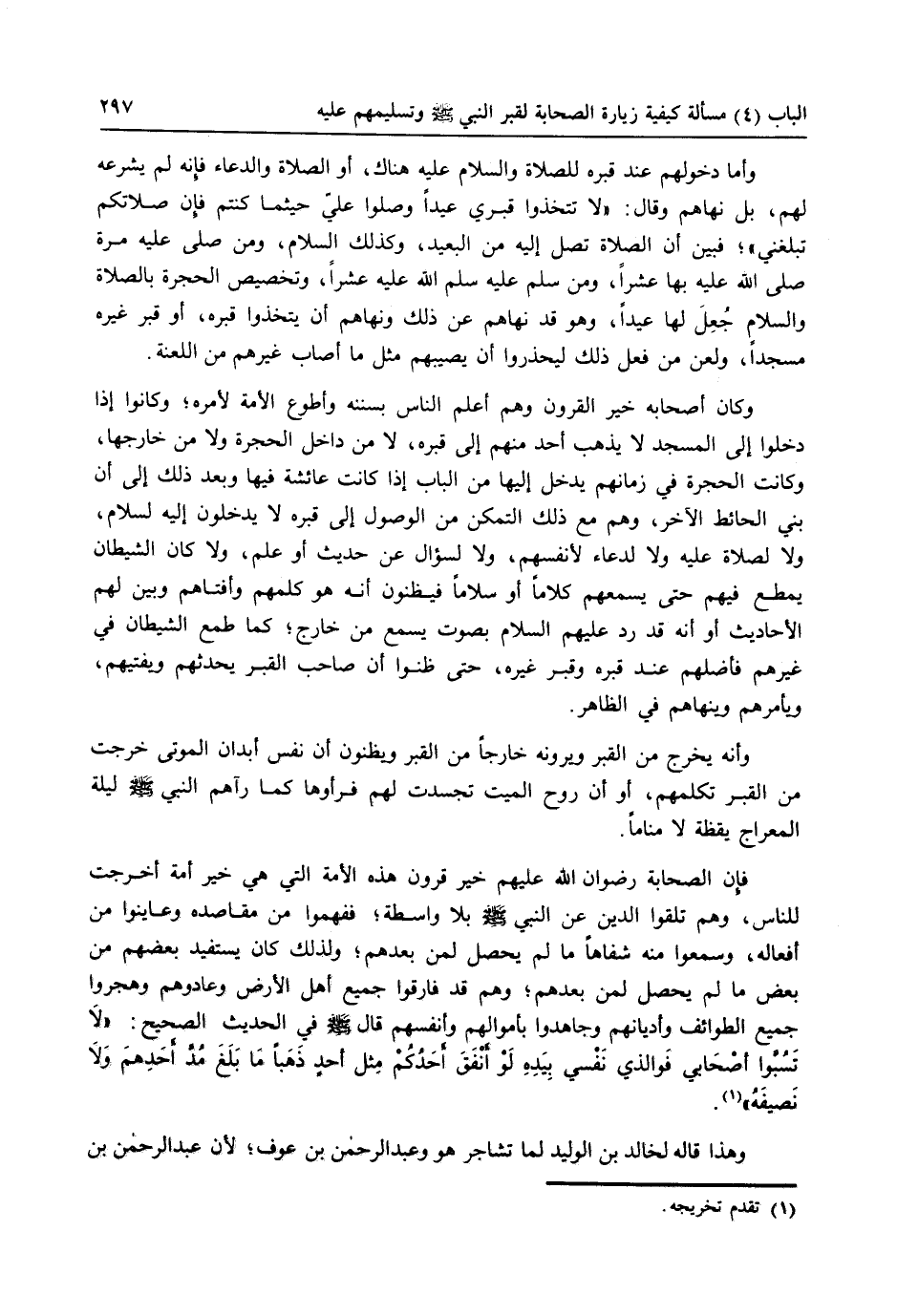 وكان أصحابه خير القرون وهم أعلم الناس بسنته وأطوع الأمة لأمره، وكانوا إذا دخلوا إلى المسجد لا يذهب أحد منهم إلى قبره، لا من داخل الحجرة ولا من خارجها، وكانت الحجرة في زمانهم يدخل إليها من الباب إذا كانت عائشة فيها وبعد ذلك إلى أن بني الحائط الأخر، وهم مع ذلك التمكن من الوصول إلى قبره لا يدخلون إليه لسلام، ولا لصلاة عليه، ولا لدعاء لأنفسهم، ولا لسؤال عن حديث أو علم،ولا كان الشيطان يمطع فيهم حتى يسمعهم كلاماً أو سلاماً فيظنون أنه هو كلمهم، واقناعهم وبين لهم الأحاديث أو أنه قد رد عليهم السلام بصوت يسمع من خارج، كما طمع الشيطان في غيرهم فأضلهم عند قبره وقبر غيره، حتى ظنوا أن صاحب القبر يحدثهم ويفتيهم،ويأمرهم وينهاهم في الظاهر.