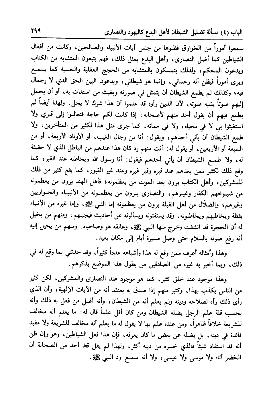 سمعوا أموراً من الخوارق فظنوها من جنس آيات الأنبياء والصالحين، وكانت من أفعال الشياطين كما أضل النصارى، وأهل البدع بمثل ذلك، فهم يتبعون المتشابه من الكتاب ويدعون المحكم، ولذلك يتمسكون بالمتشابه من الحجج العقلية والحسية كما يسمع ويرى أموراً فيظن أنه رحماني، وإنما هو شيطاني، ويدعون البين الحق الذي لا إجمال فيه، وكذلك لم يطمع الشيطان، أن يتمثل في صورته ويغيث من استغاث به، أو أن يحمل إليهم صوتاً يشبه صوته، لأن الذين رأوه قد علموا أن هذا شرك لا يحل، ولهذا أيضاً لم يطمع فيهم أن يقول أحد منهم لأصحابه، إذا كان لكن حاجة فتعالوا إلى قبري ولا استغيثوا بي لا في محياه، ولا في مماته، كما جرى مثل هذا لكثير من المتأخرين، ولا طمع الشيطان أن يأتي أحدهم، ويقول: أنا من رجال الغيب، أو الأوتاد الأربعة، أو من السبعة أو الأربعين، أو يقول له: أنت منهم إذا كان هذا عندهم من الباطل الذي لا حقيقة له، ولا طمع الشيطان أن يأتي أحدهم فيقول:أنا رسول الله ويخاطبه عند القبر، كما وقع ذلك لكثير ممن بعدهم عند قبر وقبر غيره وعند غير القبور، كما يقع كثير من ذلك للمشركين، وأهل الكتاب يرون بعد الموت من يعظمونه، فأهل الهند يرون من يعظمونه من شيوخهم الكفار وغيرهم، والنصارى يرون من يعظمونه من الأنبياء والحواريين وغيرهم، والضلال من أهل القبلة يرون من يعظمونه إما النبي صلى الله عليه وسلم، وإما غيره من الأنبياء يقظة ويخاطبهم ويخاطبونه، وقد يستفتونه ويسألونه عن أحاديث فيجيبهم، ومنهم ن يخيل له أن الحجرة قد انشقت وخرج منها النبي صلى الله عليه وسلم وعانقه هو وصاحباه،ومنهم من يخيل إليه أنه رفع صوته بالسلام حتى وصل مسيرة أيام إلى مكان بعيد.
