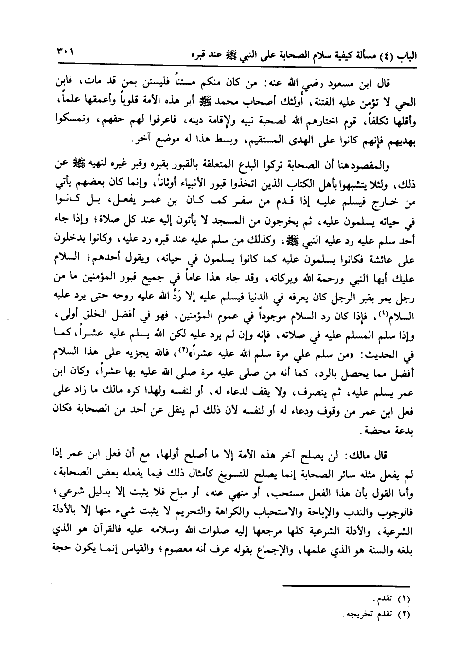 والمقصود هنا أن الصحابة تركوا البدع المتعلقة بالقبور بقبره وقبر غيره لنهيه صلى الله عليه وسلم عن ذلك ولئلا يتشبهوا بأهل الكتاب الذين اتخذوا قبور الأنبياء أوثاناً، وإنما كان بعضهم يأتي من خارج فيسلم عليه إذا قدم من سفر كما كان بن عمر يفعل، بل كانوا في حياته يسلمون عليه، ثم يخرجون من المسجد لا يأتون إليه عند كل صلاة، وإذا جاء أحد سلم عليه رد عليه النبي صلى الله عليه وسلم، وكذلك من سلم عليه عند قبره رد عليه، وكانوا يدخلون على عائشة فكانون يسلمون عليه كما كانوا يسلمون في حياته، ويقول أحدهم السلام عليك يا أيها النبي ورحمة الله وبركاته، وقد جاء هذا عاماً في جميع قبور المؤمنين ما من رجل يمر بقبر الرجل كان يعرفه في الدنيا فيسلم عليه إلا رد الله عليه لروحه حتى يرد عليه السلام (1) ، فإذا كان رد السلام موجوداً في عموم المؤمنين، فهو في أفضل الخلق أولى، وإذا سلم المسلم عليه في صلاته، فإنه وإن لم يرد عليه لكن الله يسلم عليه عشراً، كما في الحديث: ((من سلم علي مرة سلم الله عليه عشراً)) (2) ، فالله يجزيه على هذا السلام أفضل مما يحصل بالرد، كما أنه من صلى عليه مرة صلى الله عليه عشراً، وكان ابن عمر يسلم عليه، ثم ينصرف، ولا يقف لدعاء له، أو لنفسه، ولهذا كره مالك ما زاد على فعل ابن عمر من وقوف ودعاء له أو لنفسه لأن ذلك لم ينقل عن أحد من الصحابة فكان بدعة محضة.