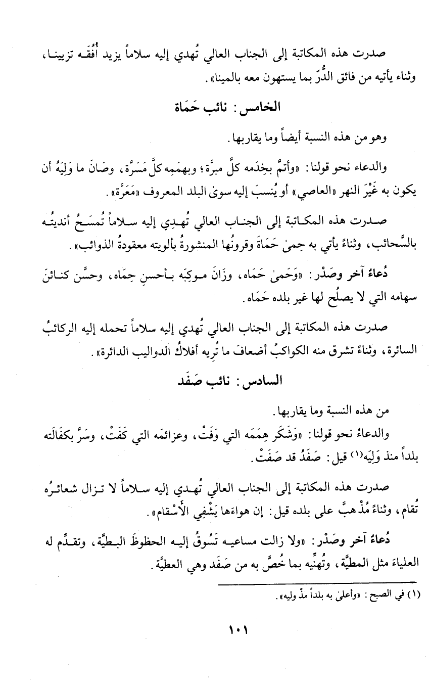 والدعاء نحو قولنا: (وأتم بخدمه كل مبرة؛ وبهممه كل مسرة، وصان ما وليه أن يكون به غير النهر (العاصي) أو ينسب إليه سوى البلد المعروف (معرة).