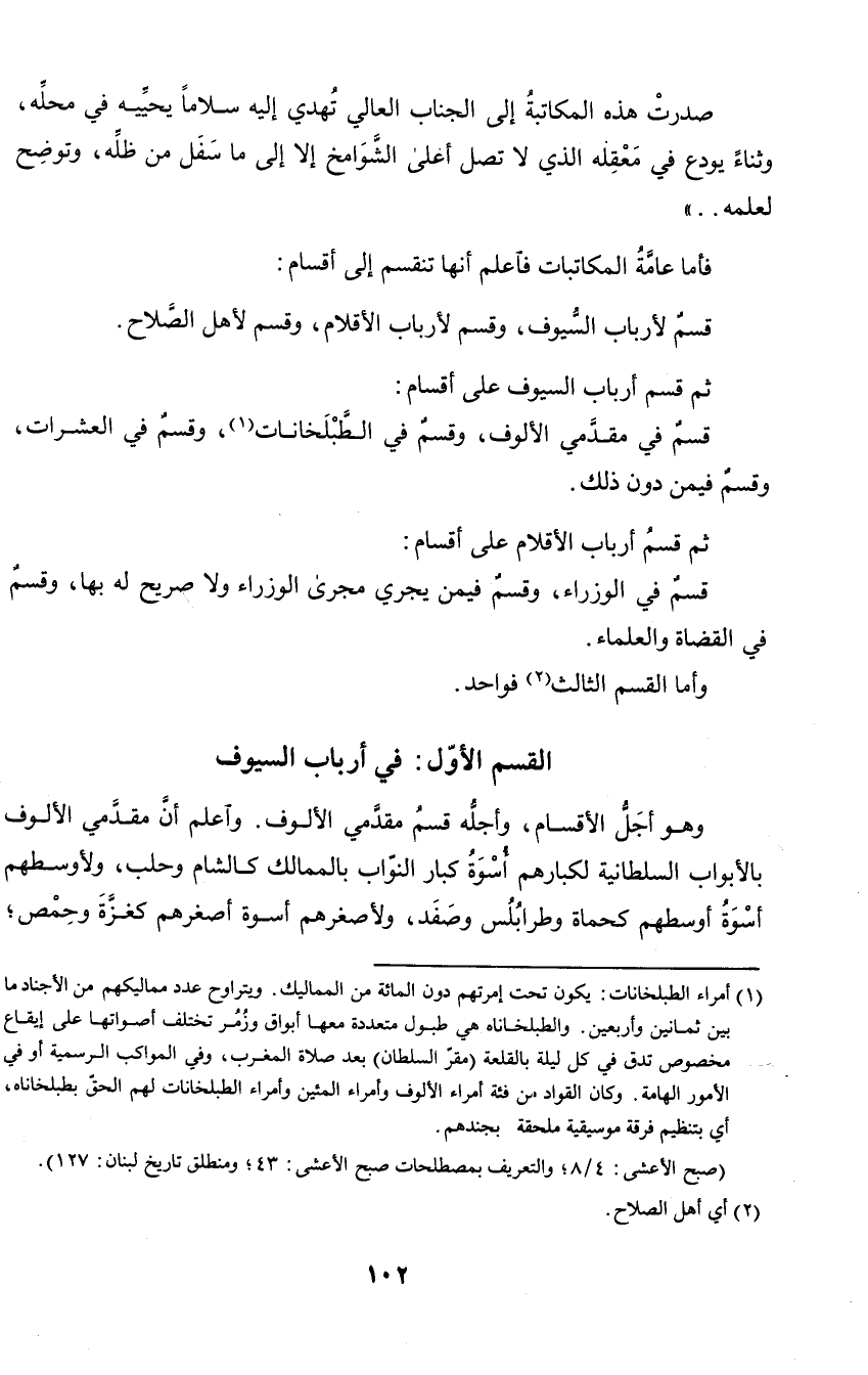 قسم لأرباب السيوف، وقسم لأرباب الأقلام، وقسم لأهل الصلاح.