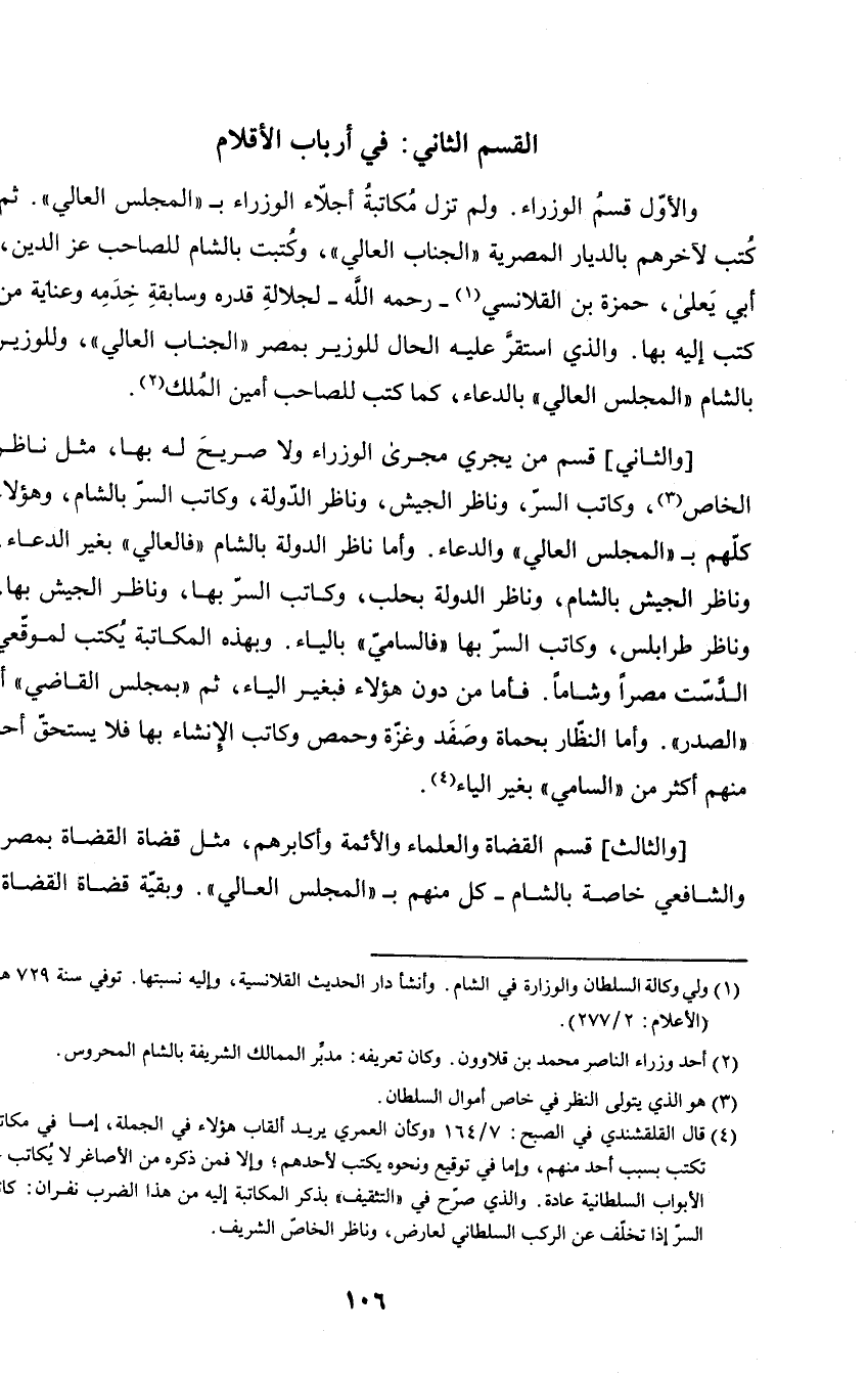 والثاني قسم من يجري مجرى الوزراء ولا صريح له بها، مثل ناظر الخاص، وكاتب السر، وناظر الجيش، ناظر الدولة، وكاتب السر بالشام، وهؤلاء كلهم بـ (المجلس العالي) والدعاء. وأما ناظر الدولة بالشام (فالعالي) بغير الدعاء. وناظر الجيش بالشام، وناظر الدولة بحلب، وكاتب السر بها، وناظر الجيش بها، وناظر طرابلس، وكاتب السر بها (فالسامي) بالياء. وبهذه المكاتبة يكتب لموقعي مصرا وشاما. فأما من دون هؤلاء فبغير الياء، ثم (بمجلس القاضي) أو (الصدر). وأما النظار بحماة وصفد وغزة وحمص وكاتب الإنشاء بها فلا يستحق أحد منهم أكثر من (السامي) بغير الياء.