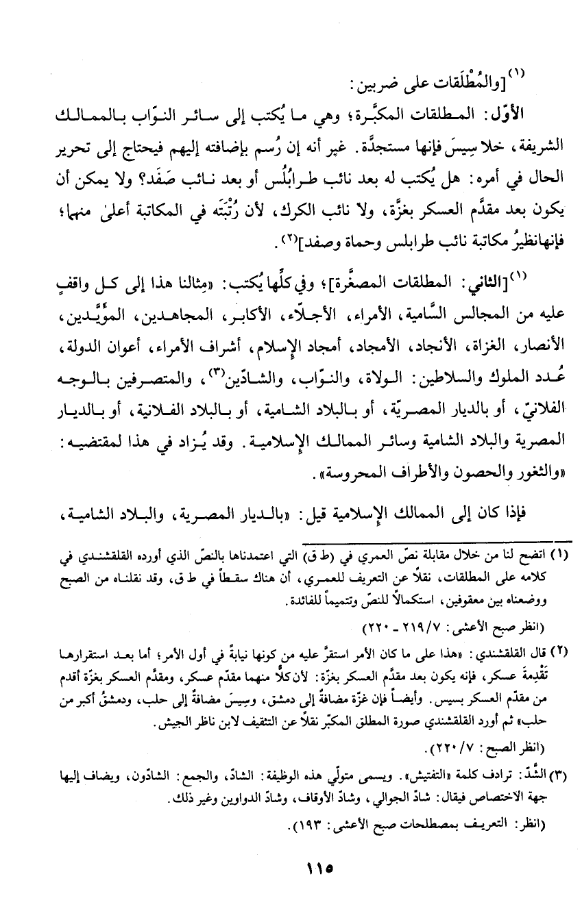 الأول: المطلقات المكبرة؛ وهي ما يكتب إلى سائر النواب بالمماليك الشريفة، خلا سيس فإنها مستنجدة. غير أنه إن رسم بإضافته إليهم فيحتاج إلى تحرير الحال في أمره: هل يكتب له بعد نائب طرابلس أو بعد نائب صفد؟ ولا يمكن أن يكون بعد مقدم العسكر بغزة، ولا نائب الكرك، لأن رتبته في المكاتبة أعلى منهما؛ فإنها نظير مكاتبة نائب طرابلس وحماة وصفد.