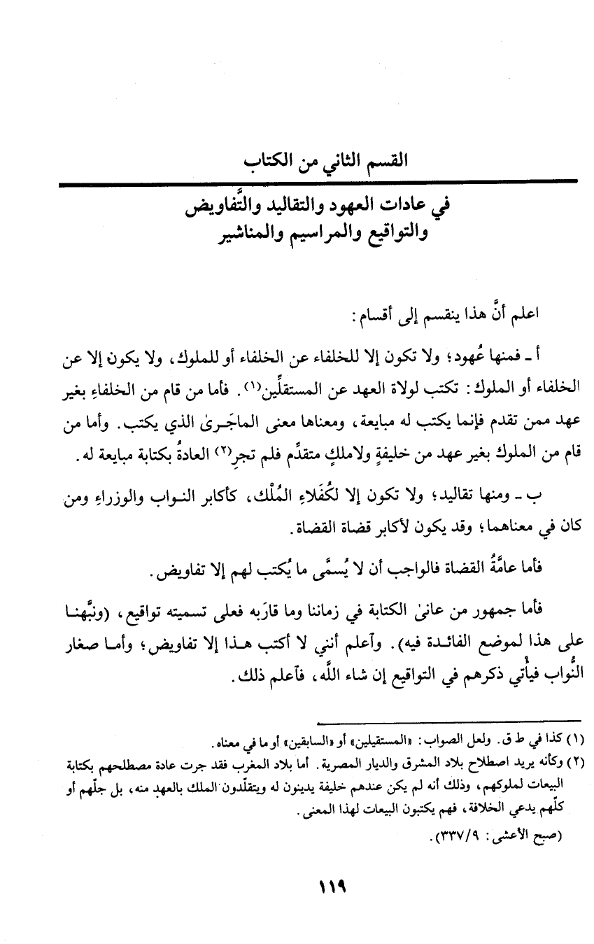 فأما جمهور من عانى الكتابة في زماننا وما قاربه فعلى تسمية تواقيع، (ونبهنا على هذا لموضع الفائدة فيه). واعلم أنني لا أكتب هذا إلا تفاويض؛ وأما صغار النواب فيأتي ذكرهم في التواقيع إن شاء الله، فاعلم ذلك.