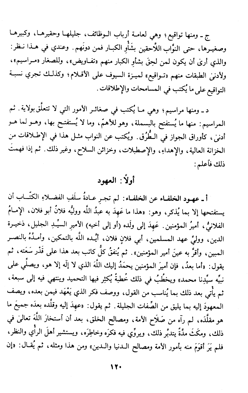 ج - ومنها تواقيع؛ وهي لعامة أرباب الوظائف، جليلها وحقيرها، وكبيرها وصغيرها، حتى النواب اللاحقين بشأو الكبار فمن دونهم. وعندي في هذا نظر: والذي أرى أن يكون لمن لحق بشأو الكبار منهم (تفاويض)، للصغار (مراسيم)، ولأدنى الطبقات منهم (تواقيع) لميزة السيوف على الأقلام؛ وكذلك تجري نسبة التواقيع على ما يكتب في المسامحات والإطلاقات.