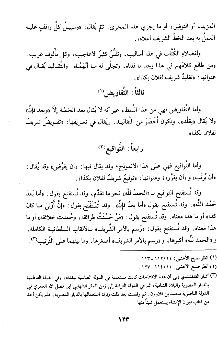 وأما التفاويض فهي من هذا النمط، غير أنه لا يقال بعد الخطبة إلا (وبعد فإن) ولا يقال (يقلد)، وتكون أخصر من التقاليد. ويقال في تعريفها: (تفويض شريف لفلان بكذا).