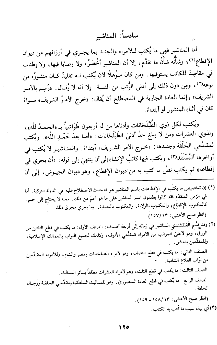 أما المناشير فهي ما يكتب للأمراء والجند بما يجري في أرزاقهم من ديوان الإقطاع؛ وشأنه شأن ما تقدم، إلا أن المناشير أخصر، ولا وصايا فيها، ولا إطناب في مقاصد للكتاب يستوفيها. ومن كان مؤهلا لأن يكتب له تقليد كان منشوره من نوعه، ومن دون ذلك إلى أدنى الرتب من النسبة. إلا أنه لا يقال: (رسم بالأمر الشريف) وإنما العادة الجارية في