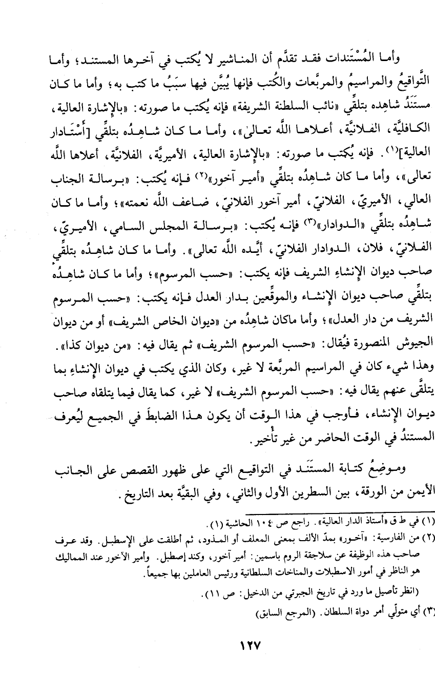 السلطة الشريفة) فإنه يكتب ما صورته: (بالإشارة العالية، الكافلية، الفلانية، أعلاها الله تعالى)، وأما ما كان شاهده بتلقي (أمير آخور) فإنه يكتب: (برسالة الجناب العالي، الأميري، الفلاني، أمير آخور الفلاني، ضاعف الله نعمته)؛ وأما ما كان شاهده بتلقي (الدودار) فإنه يكتب: (برسالة المجلس السامي، الأميري، الفلاني، أيده الله تعالى). وأما ما كان شاهده بتلقي صاحب ديوان الإنشاء الشريف فإنه يكتب: (حسب المرسوم)؛ وأما ما كان شاهده بتلقي صاحب ديوان الإنشاء والموقعين بدار لعدل فإنه يكتب (حسب المرسوم الشريف من دار العدل)؛ وأما ما كان شاهده من (ديوان الخاص الشريف) أو من ديوان الجيوش المصرية فيقال: (حسب المرسوم الشريف) ثم يقال فيه: (من ديوان كذا). وهذا شيء كان في المراسيم المربعة لا غير، وكان الذي يكتب في ديوان الإنشاء بما يتلقى عنهم يقال فيه: (حسب المرسوم الشريف) لا غير، كما يقال فيما يتلقاه صاحب ديوان الإنشاء، فأوجب في هذا الوقت أن يكون هذا الضابط في الجميع ليعرف المستند في الوقت الحاضر من غير تأخير.
