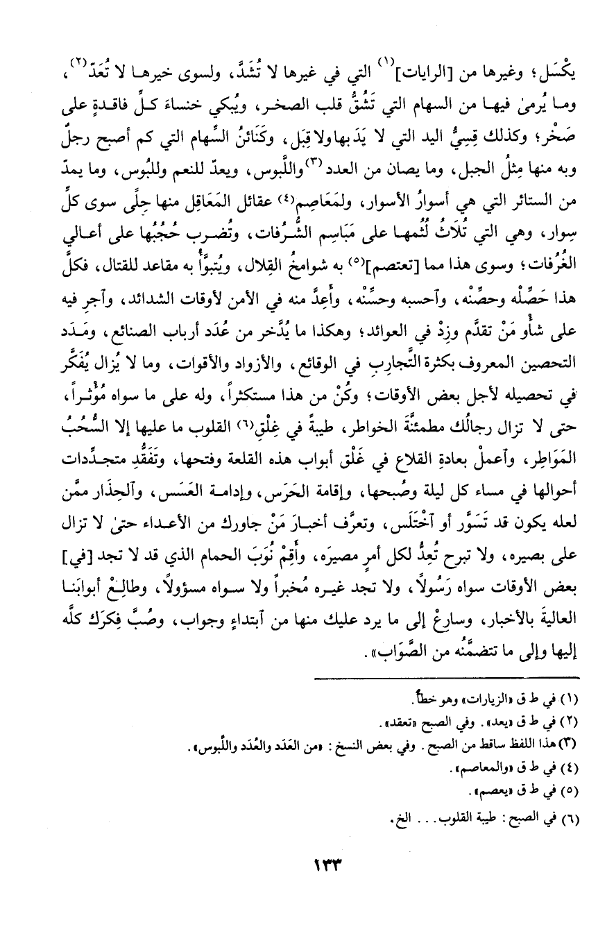 يكسل؛ وغيرها من الرايات التي في غيرها لا تشد، ولسوى خيرها لا تعد، وما يرمى فيها من السهام التي تشق قلب الصخر، ويبكي خنساء كل فاقدة على صخر؛ وكذلك قسي اليد التي لا يد بها ولا قبل، وكنائن السهام التي كم أصبح رجل وبه منها مثل الجبل، وما يصان من العدد واللبوس، ويعد للنعم وللبوس، وما يمد من الستائر التي هي أسوار الأسوار، ولمعاصم عقائل المعاقل منها حلى سوى كل سوار، وهي التي تلاث لثمها على مباسم الشرفات، وتضرب حجبها على أعالي الغرفات؛ وسوى هذا مما تعتصم به شوامخ القلال، ويتبوأ به مقاعد للقتال، فكل هذا حصله وحصنه، وأحسبه وحسنه، وأعد منه في الأمن لأوقات الشدائد، واجر فيه على شأو من تقدم وزد في العوائد؛ وكن من هذا مستكثرا، وله على ما سواه مؤثرا، حتى لا تزال رجالك مطمئنة الخواطر، طيبة في غلق القلوب ما عليها إلا السحب المواطر، واعملوا بإعادة القلاع في غلق أبواب هذه القلعة وفتحها، وتفقد متجددات أحوالها في مساء كل ليلة وصبحها، وإقامة الحرس، وإدامة العسس، والحذار ممن لعله