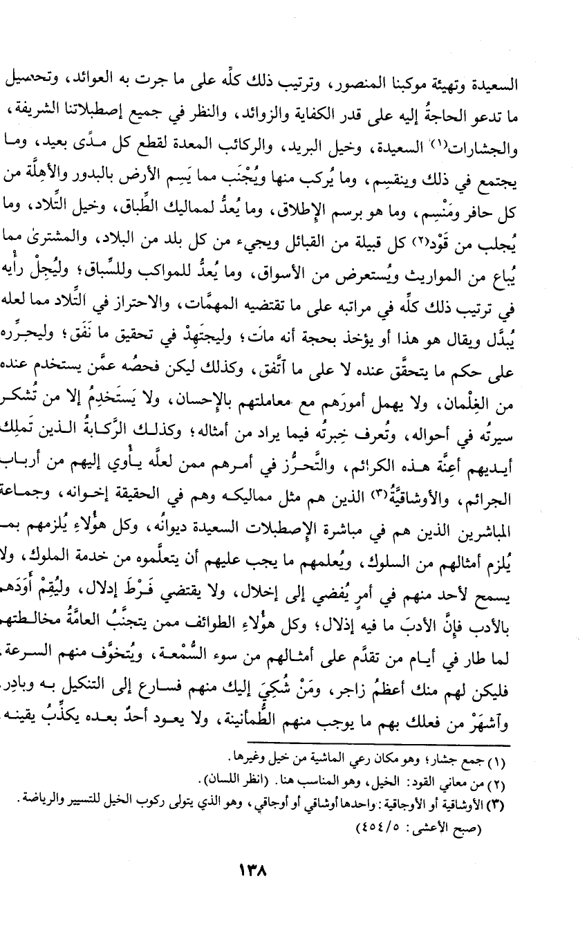 السعيدة وتهيئة موكبنا المنصور، وترتيب ذلك كله على ما جرت به العوائد، وتحصيل ما تدعو الحاجة إليه على قدر الكفاية والزوائد، والنظر في جميع إسطبلاتنا الشريفة، والجشارات السعيدة، وخيل البريد، والركائب المعدة لقطع كل مدى بعيد، وما يجتمع في ذلك وينقسم، وما يركب منها ويجنب مما يسم الأرض بالبدور والأهلة من كل حافر ومنسم، وما هو برسم الإطلاق، وما يعد لمماليك الطباق، وخيل التلاد، وما يجلب من وقود كل قبيلة من القبائل ويجيء من كل بلد من البلاد، والمشترى مما يباع من المواريث ويستعرض من الأسواق، وما يعد للمواكب وللسباق، ولجل رأيه في ترتيب ذلك كله في مراتبه على ما تقتضيه المهمات، والاحتراز في التلاد مما لعله يبدل ويقال هو هذا أو يؤخذ بحجة أنه مات؛ وليجتهد في تحقيق ما نفق؛ وليحرره على حكم ما يتحقق عنده لا على ما اتفق، وكذلك ليكن فحصه عمن يستخدم عنده من الغلمان، ولا يهمل أمورهم مع معاملتهم بالإحسان، ولا يستخدم إلا من تشكر سيرته في أحواله، وتعرف خبرته فيما يراد من أمثاله؛ وكذلك الركابة الذين تملك أيديهم أعنة هذه الكرائم، والتحرز في أمرهم ممن لعله يأوي إليهم من أرباب الجرائم، والأوشاقية الذين هم مثل مماليكه وهم في الحقيقة إخوانه، وجماعة المباشرين الذين هم في مباشرة الإسطبلات السعيدة ديوانه، وكل هؤلاء يلزمهم بما يلزم أمثالهم من السلوك، ويعلمهم ما يجب عليهم أن