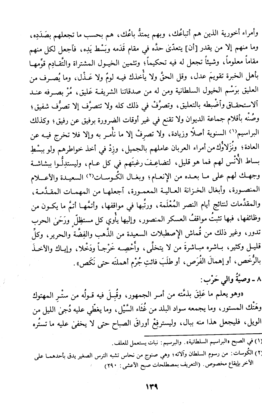 وأمراء أخورية الذين هم أتباعكن وبهم يمتد باعك، هم بحسب ما تجعلهم بصدده، وما منهم إلا من يقدر أن يتعدى حده في مقام قدمه وبسط يده، فاجعل لكل منهم مقاما معلوما، وشيئا تجعل له فيه تحكيما؛ وتثمين الخيول المشتراة والتقادم قومها بأهل الخبرة تقويم عدل، وقل الحق ولا يأخذك فيه لوم ولا عذل، وما يصرف من العليق برسم الخيول السلطانية ومن له من صدقاتنا الشريفة عليق، مر بصرفه عند الاستحقاق واضبطه بالتعليق، وتصرف في ذلك كله ولا تتصرف إلى تصرف شفيق؛ وصنه بأقلام جماعة الديوان ولا تقنع في غير أوقات الضرورة برفيق عن رفيق؛ وكذلك البراسيم السنوية أصلا وزيادة، ولا تصرف إلا ما نأمر به وإلا فلا تخرج فيه عن العادة؛ ونزلاؤك من أمراء العربان عاملهم بالجميل، وزد في أخذ خواطرهم ولو ببسط بساط الأنس لهم فما هو قليل، لتضاعف رغبتهم في كل عام، وليستدلوا ببشاشة وجهك لهم على ما بعده من الأنعام؛ وبغال الكوسات السعيدة والأعلام المنصورة، وأبغال الخزانة العالية المعمورة، اجعلها من المهمات المقدمة، والمقدمات لنتائج أيام النصر المعلمة، ورتبتها في مواقفها، وأتمها أتم ما يكون من وظائفها، فبها تثبت مواقف العسكر المنصور، وإليها يأوي كل مستظل ورحى الحرب تدور، وغير ذلك من قماش الإسطبلات السعيدة من الذهب والفضة والحرير، وكل قليل وكثير، باشره مباشرة من لا يتخلى، وأحصه خرجا ودخلا، وإياك والأخذ بالرخص، أو إهمال الفرص، أو طلب فائت جرم أهملته حتى نكص).