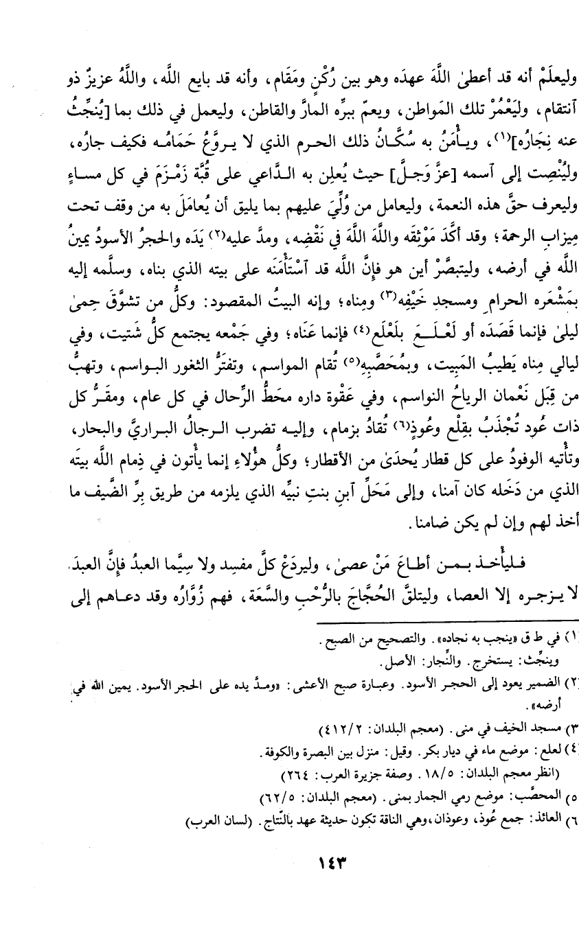 وليعلم أنه قد أعطى الله عهده وهو بين ركن ومقام، وأنه قد بايع الله، والله عزيز ذو انتقام، وليعمر تلك المواطن، ويعم ببره المار والقاطن، وليعمل في ذلك بما ينجث عنه نجاره، ويأمن به سكان ذلك الحرم الذي لا يروع حمامه فكيف جاره، ولينصت إلى اسمه عز وجل حيث يعلن به الداعي على قبة زمزم في كل مساء وليعرف حق هذه النعمة، وليعامل من ولي عليهم بما يليق أن يعامل به من وقف تحت ميزاب الرحمة؛ وقد أكد موثقه والله الله في نقضه، ومد عليه يده والحجر الأسود يمين الله في أرضه، وليتبصر أين هو فإن الله قد استأمنه على بيته الذي بناه، وسلمه إليه في بمشعره الحرام ومسجد خيفه ومناه؛ وإنه البيت المقصود: وكل من تشوق حمى ليلى فإنما قصده أو لعلع بلعلع فإنما عناه؛ وفي جمعه يجتمع كل شتيت، وفي ليالي مناه يطيب المبيت، وبمحصبه تقام المواسم، وتفتر الثغور البواسم، وتهب من قبل نعمان الرياح النواسم، وفي عقوة داره محط الرحال في كل عام، ومقر كل ذات عود تجذب بقلع وعوذ تقاد بزمام، وإليه تضرب الرجال البراري والبحار، وتأتيه الوفود على كل قطار يحدى من الأقطار؛ وكل هؤلاء إنما يأتون في ذمام الله بيته الذي من دخله كان آمنا، وإلى محل ابن بنت نبيه الذي يلزمه من طريق بر الضيف ما أخذ لهم وإن لم يكن ضامنا.