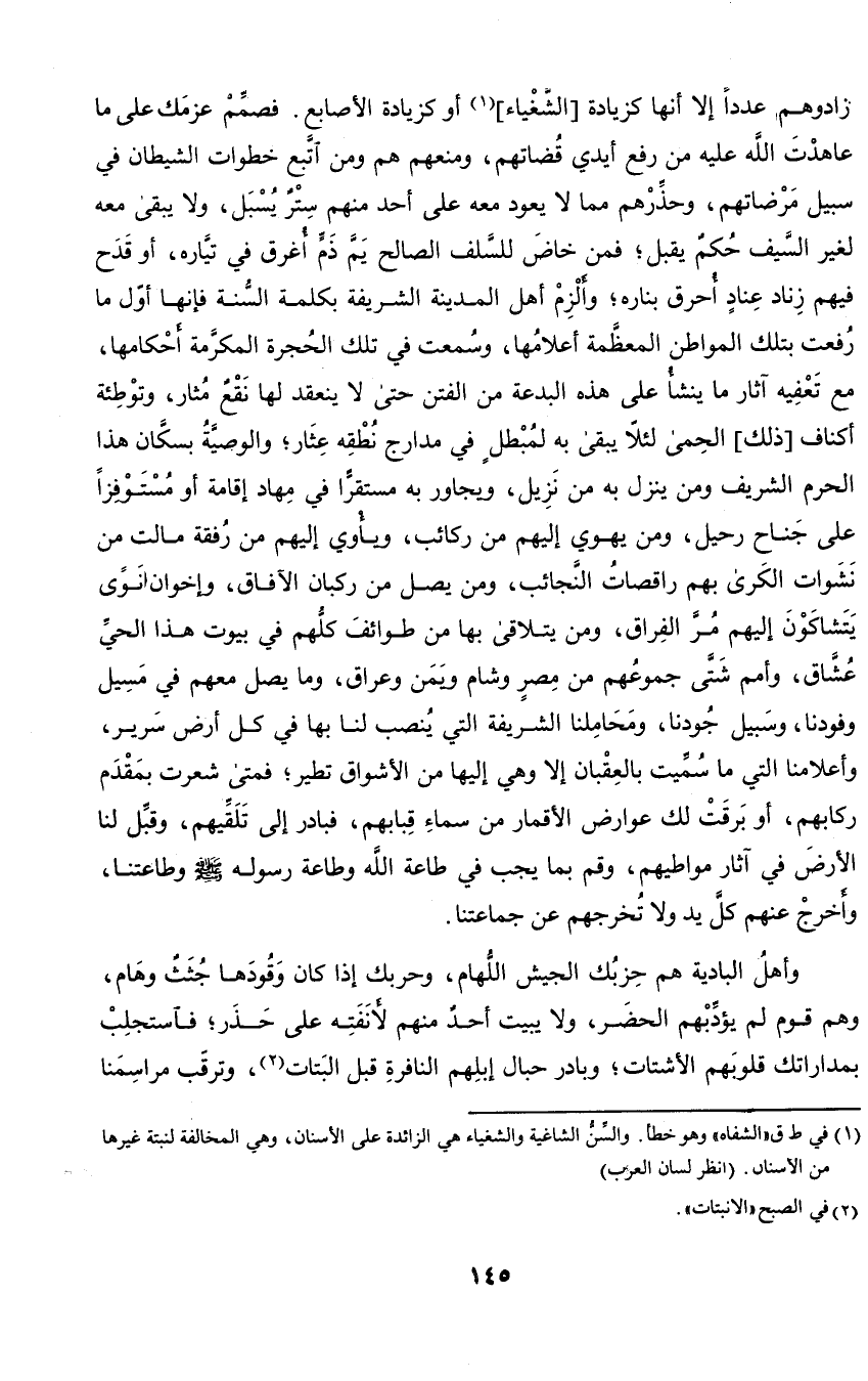 زادوهم عددا إلا أنها كزيادة الشغياء أو كزيادة الأصابع. فصمم عزمك على ما عاهدت الله عليه من رفع أيدي قضاتهم، ومنعهم هم ومن اتبع خطوات الشيطان في سبيل مرضاتهم، وحذرهم مما لا يعود معه على أحد منهم ستر يسبل، ولا يبقى معه لغير السيف حكم يقبل؛ فمن خاض للسلف الصالح يم ذم أغرق في تياره، أو قدح فيهم زناد عناد أحرق بناره؛ وألزم أهل المدينة الشريفة بكلمة السنة فإنها أول ما رفعت بتلك المواطن المعظمة أعلامها، وسمعت في تلك الحجرة المكرمة أحكامها، مع تعفيه آثار ما ينشأ على هذه البدعة من الفتن حتى لا ينعقد لها نقع مثار، وتوطئة أكناف ذلك الحمى لئلا يبقى به لمبطل في مدارج نطقه عثار؛ والوصية بسكان هذا الحرم الشريف ومن ينزل به من نزيل، ويجاور به مستقرا في مهاد إقامة أو مستوفزا على جناح رحيل، ومن يهوي إليهم من ركائب، ويأوي إليهم من رفقة مالت من نشوات الكرى بهم راقصات النجائب، ومن يصل من ركبان الآفاق، وإخوان نوى يتشاكون إليهم مر الفراق، ومن