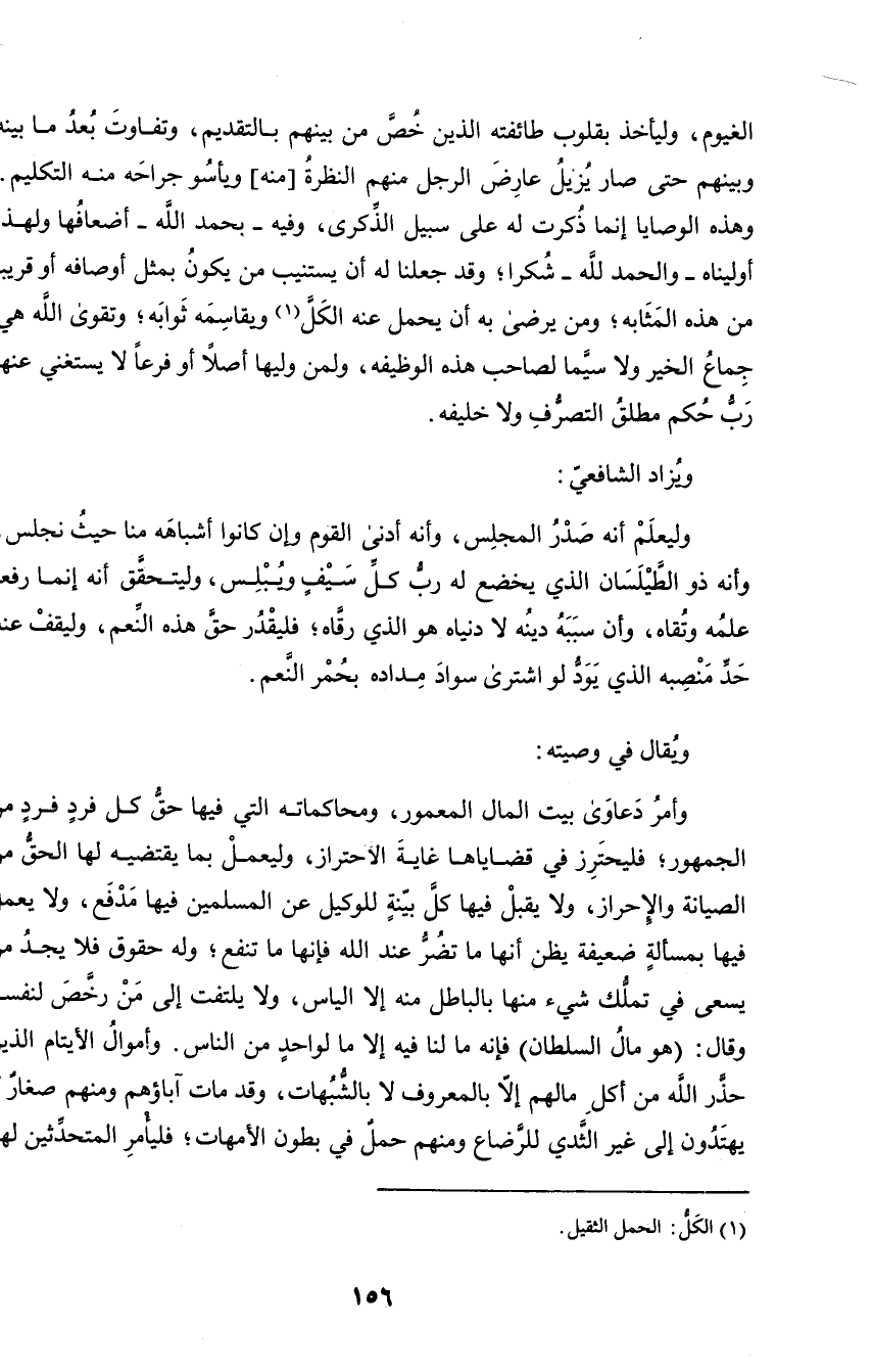 وأمر دعاوى بيت المال المعمور، ومحاكماته التي فيها حق كل فرد من الجمهور؛ فليحترز في قضاياها غاية الاحتراز، وليعمل بما يقتضيه لها الحق من الصيانة والإحراز، ولا يقبل فيها كل بينة للوكيل عن المسلمين فيها مدفع، ولا يعمل فيها بمسألة ضعيفة يضن أنها ما تضر عند الله فإنها ما تنفع؛ وله حقوق فلا يجد من يسعى في تملك شيء منها بالباطل منه إلا الياس، ولا يلتفت إلى من رخص لنفسه وقال: (هو مال السلطان) فإنه ما لنا فيه إلا ما لواحد من الناس. وأموال الأيتام الذين حذر الله من أكل مالهم إلا بالمعروف لا بالشبهات، وقد مات آباؤهم ومنهم صغار لا يهتدون إلى غير الثدي للرضاع ومنهم حمل في بطون الأمهات؛ فليأمر المتحدثين لهم
