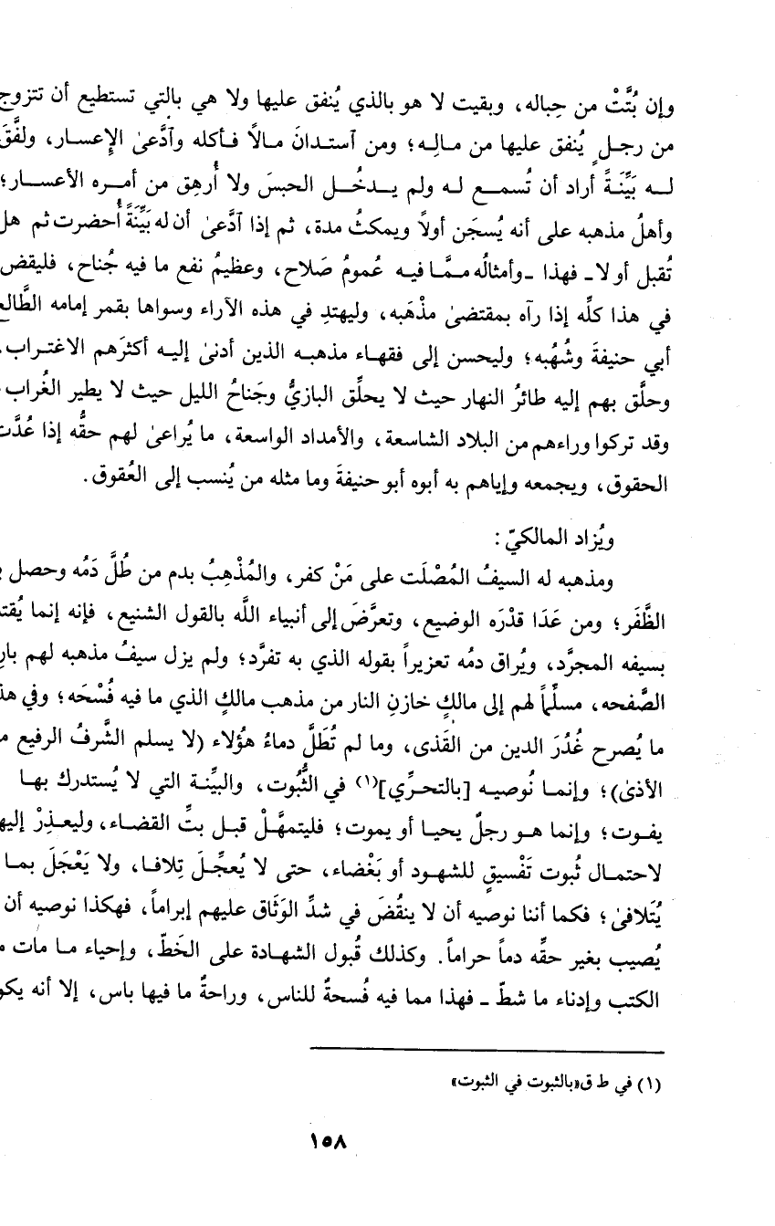 وإن بتت من حباله، وبقيت لا هو بالذي ينفق عليها ولا هي بالتي تستطيع أن تتزوج من رجل ينفق عليها من ماله؛ ومن استدان مالا فأكله وادعى الإعسار، ولفق له بينة أراد أن تسمع له ولم يدخل الحبس ولا أرهق من أمره الأعسار؛ وأهل مذهبه على أنه يسجن أولا ويمكث مدة، ثم إذا ادعى أن له بينة أحضرت ثم هل تقبل أو لا - فهذا - وأمثاله وما فيه عموم صلاح وعظيم نفع ما فيه جناح، فليقض في هذا كله إذا رآه بمقتضى مذهبه، وليهتد في هذه الآراء وسواها بقمر إمامه الطالع أبي حنيفة وشهبه؛ وليحسن إلى فقهاء مذهبه الذي أدنى إليه أكثره الاغتراب، وحلق بهم إليه
