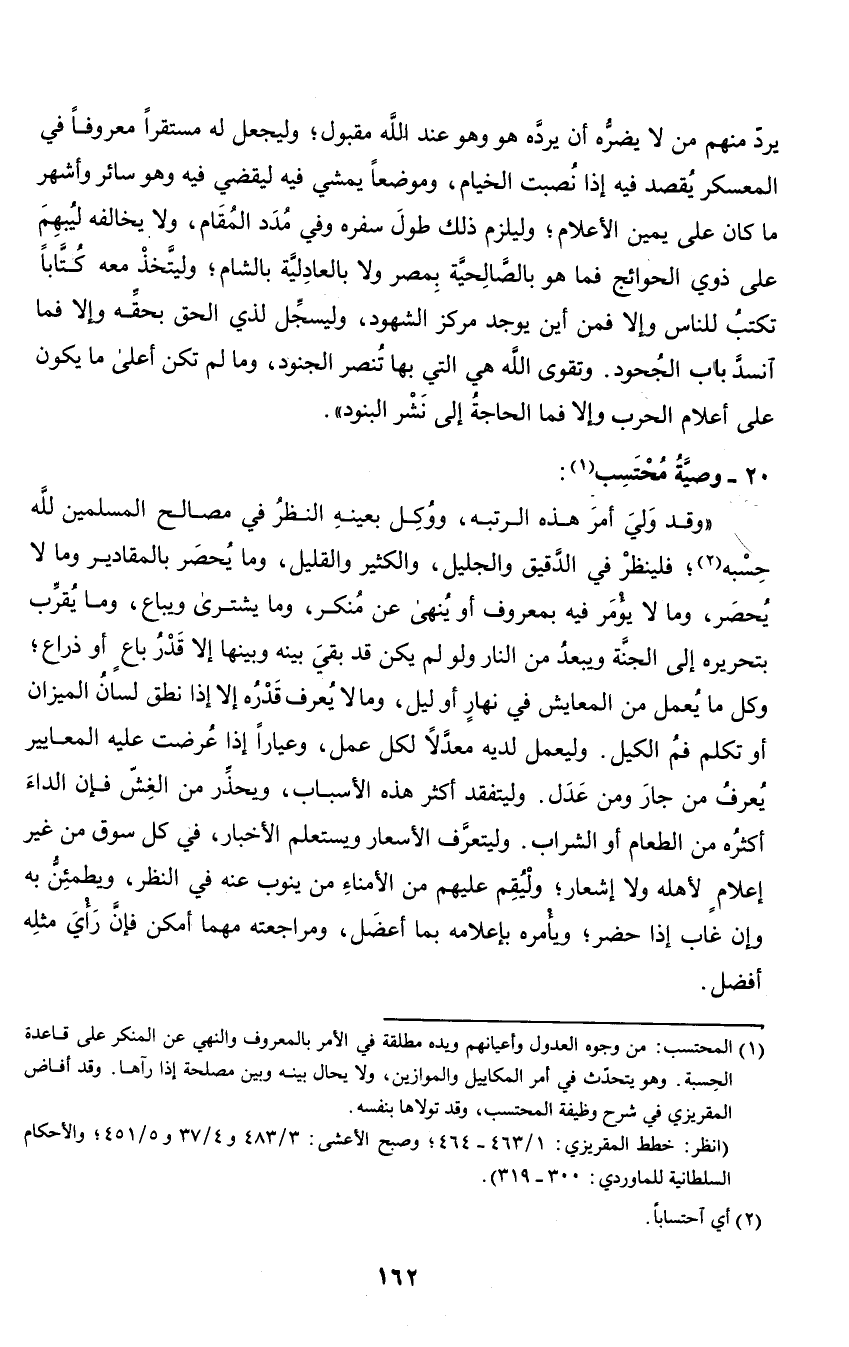 (وقد ولي أمر هذه الرتبة، ووكل بعينه النظر في مصالح المسلمين لله حسبه؛ فلينظر في الدقيق والجليل، والكثير والقليل، وما يحصر بالمقادير وما لا يحصر، وما لا يأمر فيه بمعروف أو ينهى عن منكر، وما يشترى ويباع، وما يقرب بتحريره إلى الجنة ويبعد من