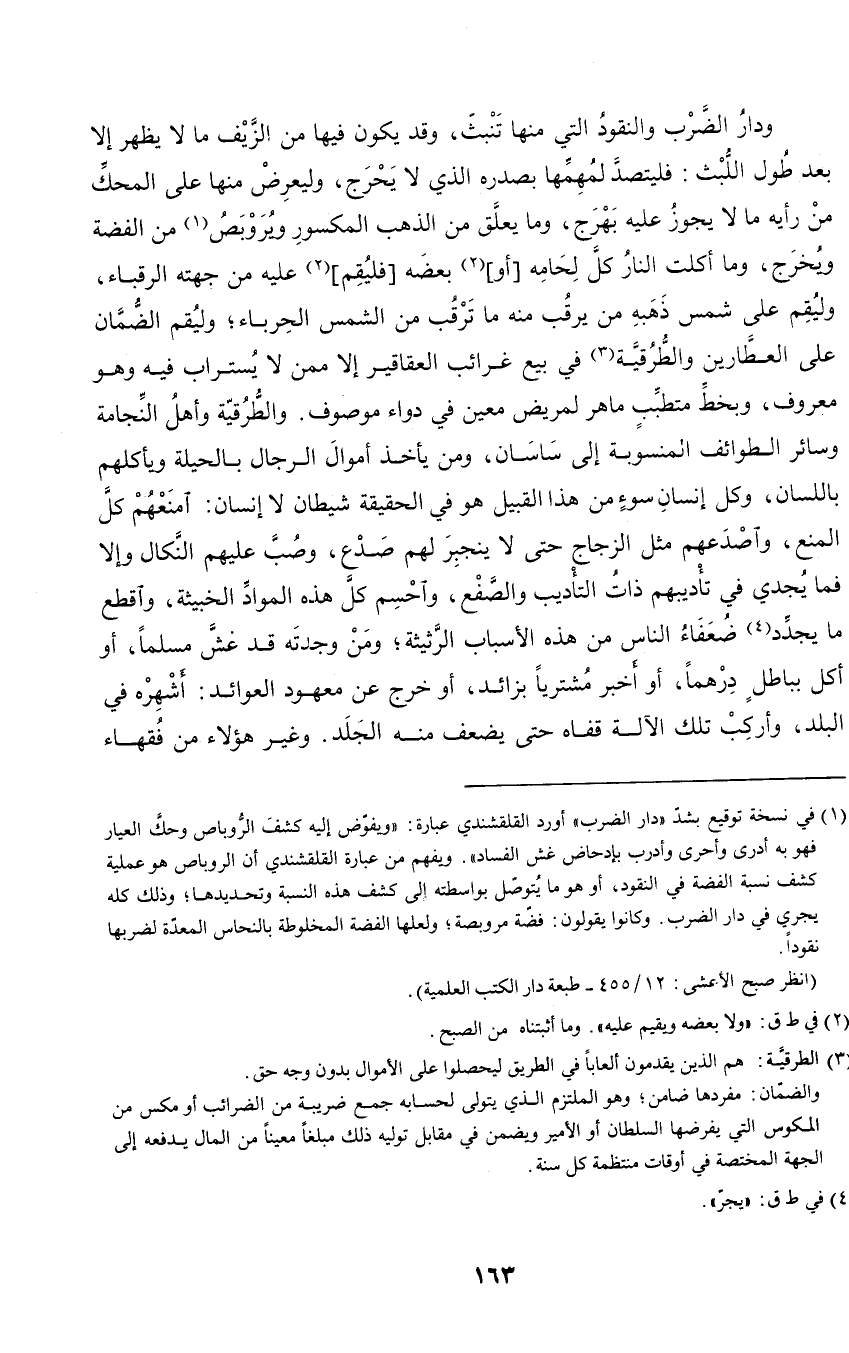 ودار الضرب والنقود التي منها تنبث، وقد يكون فيها من الزيف ما لا يظهر إلا بعد طول اللبث: فليتصد لمهمها بصدره الذي لا يحرج، وليعرض منها على المحك من رأيه ما لا يجوز عليه بهرج، وما يعلق من الذهب المكسور ويروبص من الفضة ويخرج، وما أكلت النار كل لحامه أو بعضه فليقم عليه من جهته الرقباء، وليقم على شمس ذهبه من يرقب منه ما ترقب من الشمس الحرباء؛ وليقم الضمان على العطارين والطرقية في بيع غرائب العقاقير إلا ممن لا يستراب فيه وهو معروف، وبخط متطبب ماهر لمريض معين في دواء موصوف. والطرقية وأهل النجامة وسائر الطوائف المنسوبة إلى ساسان، ومن يأخذ أموال الرجال بالحيلة ويأكلهم باللسان، وكل إنسان سوء من هذا القبيل هو في الحقيقة شيطان لا إنسان: امنعهم كل المنع، واصدعهم مثل الزجاج حتى لا ينجبر لهم صدع، وصب عليهم النكال وإلا فما يجدي في تأديبهم ذات التأديب والصفع، واحسم كل هذه المواد الخبيثة، واقطع ما يجدد ضعفاء الناس من هذه الأسباب الرثيثة؛ ومن وجدته قد غش مسلما، أو أكل بباطل درهما، أو أخبر مشتريا بزائد، أو أخرج عن معهود العوائد: أشهره في البلد، وأركب تلك الآلة قفاه حتى يضعف منه الجلد. وغير هؤلاء من فقهاء