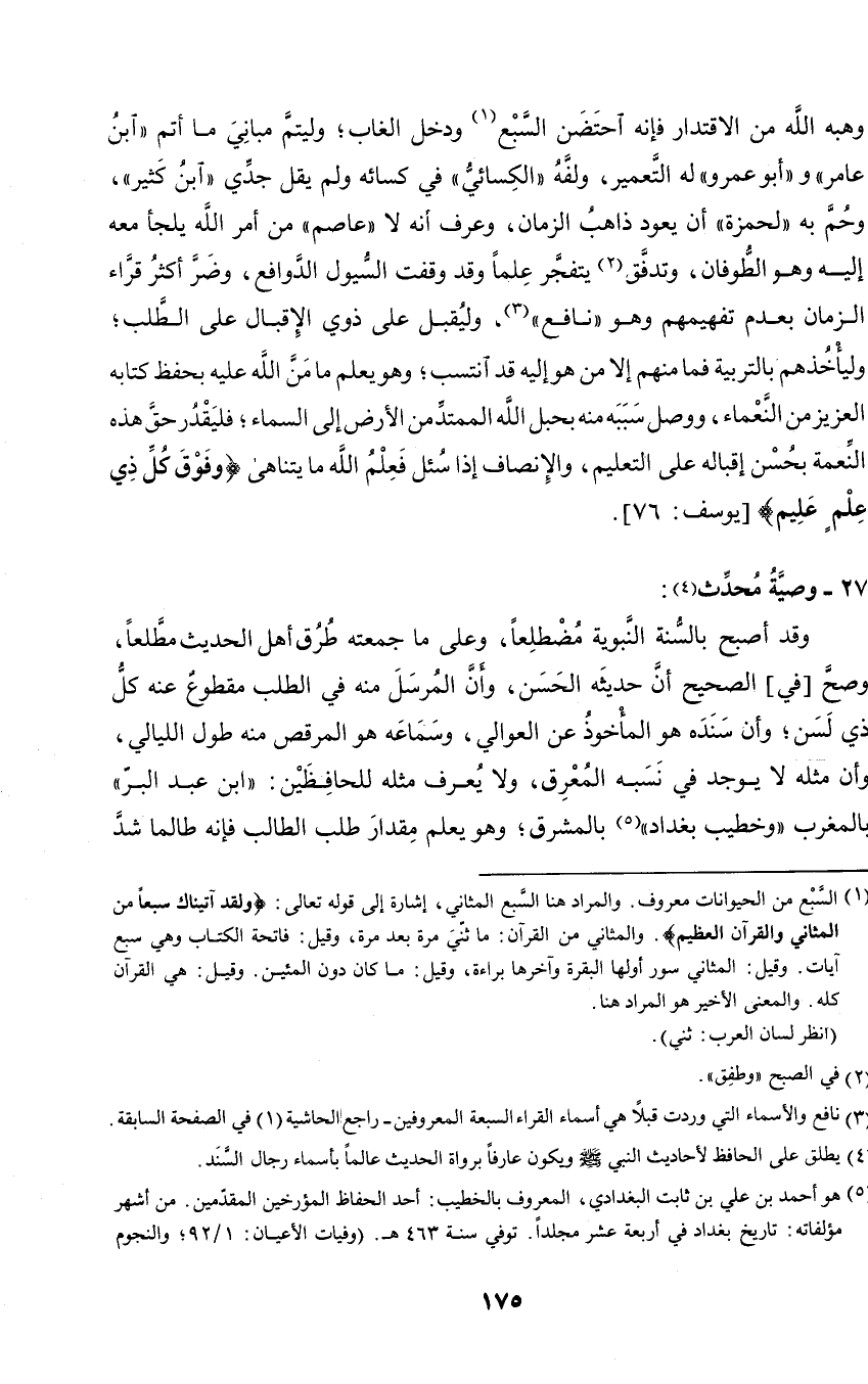 وهبه الله من الاقتدار فإنه احتضن السبع ودخل الغاب؛ وليتم مباني ما أتم (ابن عامر) و (أبو عمرو) له التعمير، ولفه (الكسائي) في كسائه ولم يقل جدي (ابن كثير)، وحم به (لحمزة) أن يعود ذاهب الزمان، وعرف أنه لا (عاصم) من أمر الله يلجأ معه إليه وهو الطوفان، وتدفق يتفجر علما وقد وقفت السيول الدوافع، وضر أكثر قراء الزمان بعدم تفهيمهم وهو (نافع)، وليقبل على ذوي الإقبال على الطلب؛ وليأخذهم بالتربية فما منهم إلا من هو إليه قد انتسب؛ وهو يعلم ما من الله عليه بحفظ كتابه العزيز من النعماء، ووصل سببه منه بحبل الله الممتد من الأرض إلى السماء؛ فليقدر حق هذه النعمة بحسن إقباله على التعليم، والإنصاف إذا سئل فعلم الله ما يتناهى {وفوق كل ذي علم عليم}.