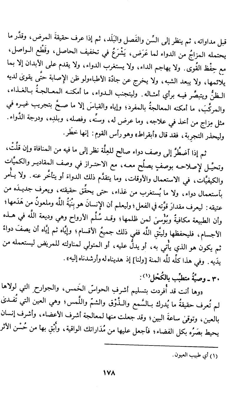 (وها أنت أفردت بتسليم أشرف الحواس الخمس، والجوارح التي لولاها لم تعرف حقيقة ما يدرك بالسمع والذوق والشم واللمس؛ وهي العين التي تفدى بالعين، وتوقى ساعة البين؛ وقد جعلت منها لمعالجة أشرف الأعضاء، وأشرف إنسان يحيط بصره بكل الفضاء؛ فاجعل عليها من مداراتك الواقية، وأبق بها من حسن الأثر