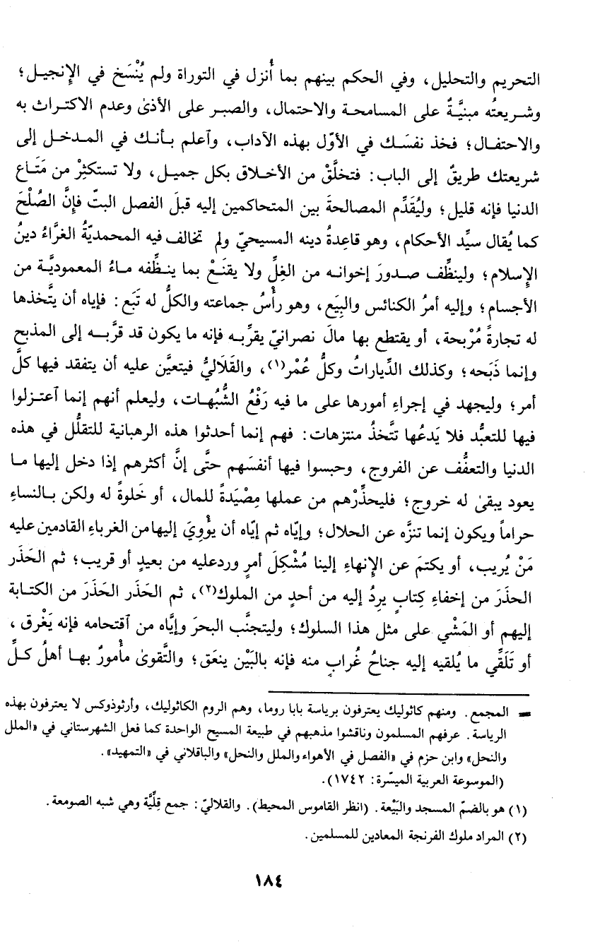 التحريم والتحليل، وفي الحكم بينهم بما أنزل في التوراة ولم ينسخ في الإنجيل؛ وشريعته مبينة على المسامحة والاحتمال، والصبر على الأذى وعدم الاكتراث به والاحتفال؛ فخذ نفسك في الأول بهذه الآداب، واعلم أنك في المدخل إلى شريعتك طريق إلى الباب: فتخلق من الأخلاق بكل جميل، ولا تستكثر من متاع الدنيا فإنه قليل؛ وليقدم المصالحة بين المتحاكمين إليه قبل الفصل البت فإن الصلح كما يقال سيد الأحكام، وهو قاعدة دينه المسيحي ولم تخالف فيه المحمدية الغراء دين الإسلام؛ ولينظف صدور إخوانه من الغل ولا يقنع بما ينظفه ماء المعمودية من الأجسام؛ وإليه أمر الكنائس والبيع، وهو رأس جماعته والكل له تبع: فإياه أن يتخذها له تجارة مربحة، أو يقتطع بها مال نصراني يقربه فإنه ما يكون قد قربه إلى المذبح وإنما ذبحه؛ وكذلك الديارات وكل عمر، والقلالي فيتعين عليه أن يتفقد فيها كل أمر؛ وليجهد في إجراء أمورها على ما فيه رفع الشبهات، وليعلم أنهم إنما اعتزلوا فيها للتعبد فلا