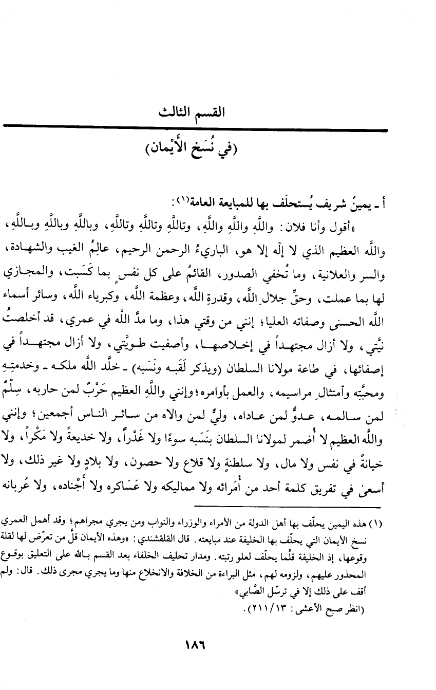 (أقول وأنا فلان: والله والله والله، وتالله وتالله وتالله، وبالله وبالله وبالله، والله العظيم الذي لا إله إلا هون البارئ الرحمن الرحيم، عالم الغيب والشهادة، والسر والعلانية، وما تخفي الصدور، القائم على كل نفس بما كسبت، والمجازي لها بما عملت، وحق جلال الله، وقدرة الله، وعظمة الله، وكبرياء الله، وسائر أسماء الله الحسنى وصفاته العليا؛ إنني من وقتي هذا، وما مد الله في عمري، قد أخلصت نيتي، ولا أزال مجتهدا في إخلاصها، وأصفيت طويتي، ولا أزال مجتهدا في أصفائها، في طاعة مولانا السلطان (ويذكر لقبه ونسبه) - خلد الله ملكه - وخدمته ومحبته وامتثال مراسيمه، والعمل بأوامره؛ وإنني والله العظيم حرب لمن حاربه، سلم لمن سالمه، عدو لمن عاداه، ولي لمن والاه من سائر الناس أجمعين؛ وإنني والله العظيم لا أضمر لمولانا السلطان بنسبه سوءا ولا غدرا، ولا خديعة ولا مكرا، ولا خيانة في نفس ولا مال، ولا سلطنة ولا قلاع ولا حصون، ولا بلاد ولا غير ذلك، ولا أسعى في تفريق كلمة أحد من أمرائه ولا مماليكه ولا عساكره ولا أجناده، ولا عربانه