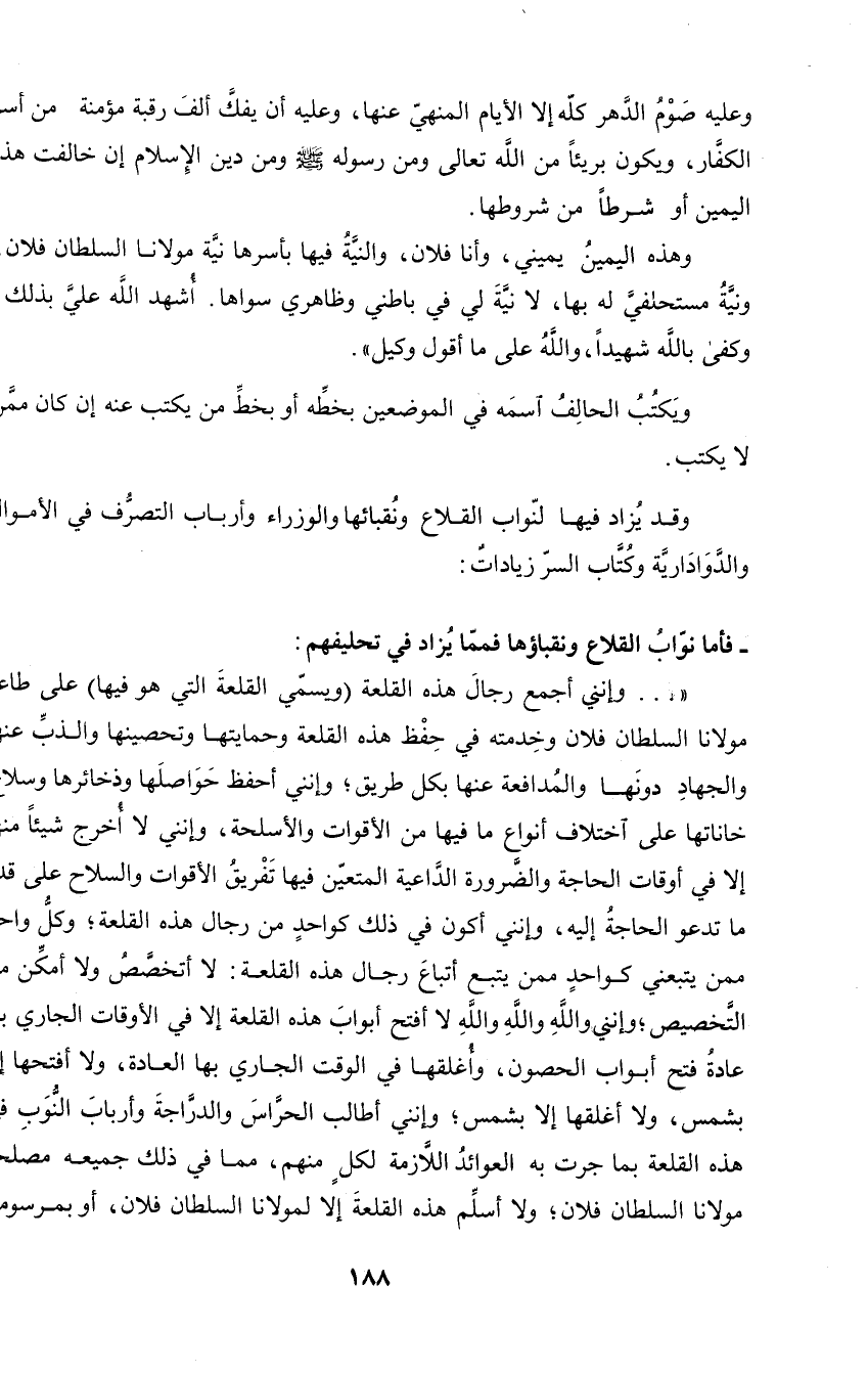 (. . . وإنني أجمع رجال هذه القلعة (ويسمي القلعة التي هو فيها) على طاعة مولانا السلطان فلان وخدمته في حفظ هذه القلعة وحمايتها وتحصينها والذب عنها والجهاد دونها والمدافعة عنها بكل طريق؛ وإنني أحفظ حواصلها وذخائرها وسلاح خاناتها على اختلاف أنواع ما فيها من الأقوات والأسلحة، وأنني لا اخرج شيئا منها إلا في أوقات الحاجة والضرورة الداعية المتعين فيها تفريق الأقوات والسلاح على قدر ما تدعو الحاجة إليه، وأنني أكون في ذلك كواحد من رجال هذه القلعة؛ وكل واحد ممن يتبعني كواحد ممن يتبع أتباع رجال هذه القلعة: لا أتخصص ولا أمكن من التخصيص؛ وإنني والله والله والله لا افتح أبواب هذه القلعة إلا في الأوقات الجاري بها عادة فتح أبواب الحصون، وأغلقها في الوقت الجاري بها العادة، ولا أفتحها إلا بشمس، ولا أغلقها إلا بشمس؛ وإنني أطالب الحراس والدراجة وأرباب النوب في هذه القلعة بما جرت به العوائد اللازمة لكل منهم، مما في ذلك جميعه مصلحة مولانا السلطان فلان؛ ولا أسلم هذه القلعة إلا لمولانا السلطان فلان، أو بمرسومه