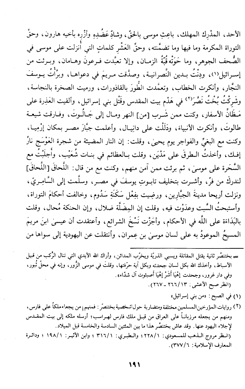 الأحد، المدرك المهلك، باعث موسى بالحق، وشاد عضده وأزره بأخيه هارون، وحق التوراة المكرمة وما فيها وما تضمنته، وحق العشر كلمات التي أنزلت على موسى في الصحف الجوهر، وما حوته قبة الزمان، وإلا تعبدت فرعون وهامان، وبرئت من إسرائيل، ودنت بدين النصرانية، وصدقت مريم في دعواها، وبرأت يوسف النجار، وأنكرت الخطاب، وتعمدت الطور بالقاذورات، ورميت الصخرة بالنجاسة، وشركت بخت نصر في هدم بيت المقدس وقتل بني إسرائيل، وألقيت العذرة على مظان الأسفار، وكنت ممن شرب من النهر ومال إلى جالوت، وفارقت شيعة طالوت، وأنكرت الأنبياء، ودللت على دانيال، وأعلمت جبار مصر بمكان إرميا، وكنت مع البغي والفواجر يوم يحيى، وقلت: إن النار المضيئة من شجرة العوسج نار إفك، وأخذت الطرق على مدين، وقلت بالعظائم في بنات شعيب، وأجلبت مع السحرة على موسى، ثم برئت ممن آمن منهم، وكنت مع من قال: اللحاق اللحاق لندرك من فر، وأشرت بيتخليف تابوت يوسف في مصر، وسلمت إلى السامري، ونزلت أريحا مدينة الجبارين، ورضيت بفعل سكنة سدوم، وخالفت أحكام التوراة، واستبحت السبت وعدوت فيه، وقلت إن المضلة ضلال، وإن الحنكة محال، وقلت بالبدائة على الله في الأحكام، وأجزت نسخ الشرائع، واعتقدت أن عيسى ابن مريم المسيح الموعود