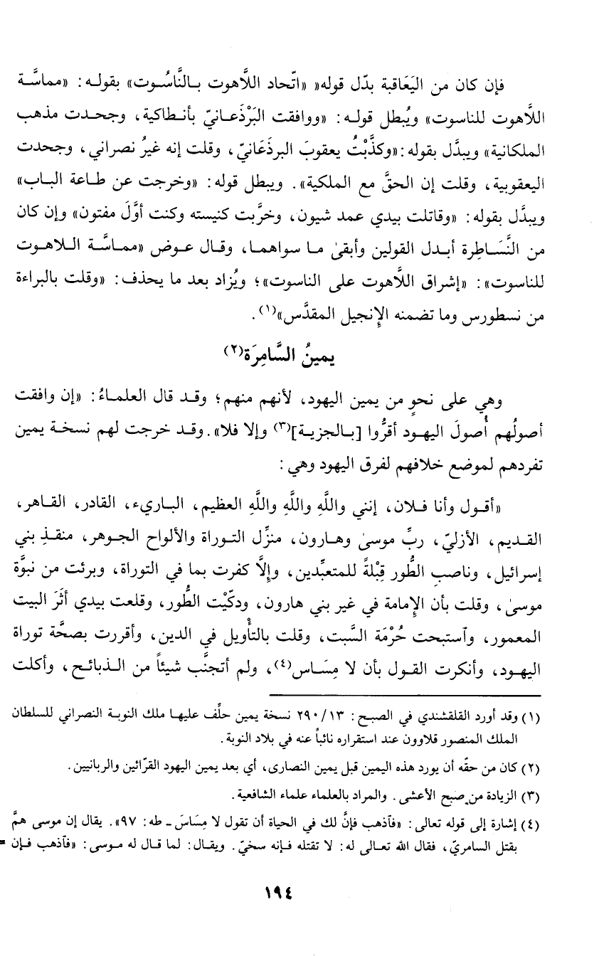 (أقول وأنا فلان، إنني والله والله والله العظيم، البارئ، القادر، القاهر، القديم، الأزلي، رب موسى وهارون، منزل التوراة والألواح الجوهر، منقذ بني إسرائيل، وناصب الطور قبلة للمتعبدين، وإلا كفرت بما في التوراة، وبرئت من نبوة موسى، وقلت بان الإمامة في غير بني هارون، ودكيت الطور، وقلعت بيدي أثر البيت المعمور، واستبحت حرمة السبت، وقلت بالتأويل في الدين، وأقررت بصحة توراة اليهود، وأنكرت القول بأن لا مساس، ولم أتجنب شيئا من الذبائح، وأكلت