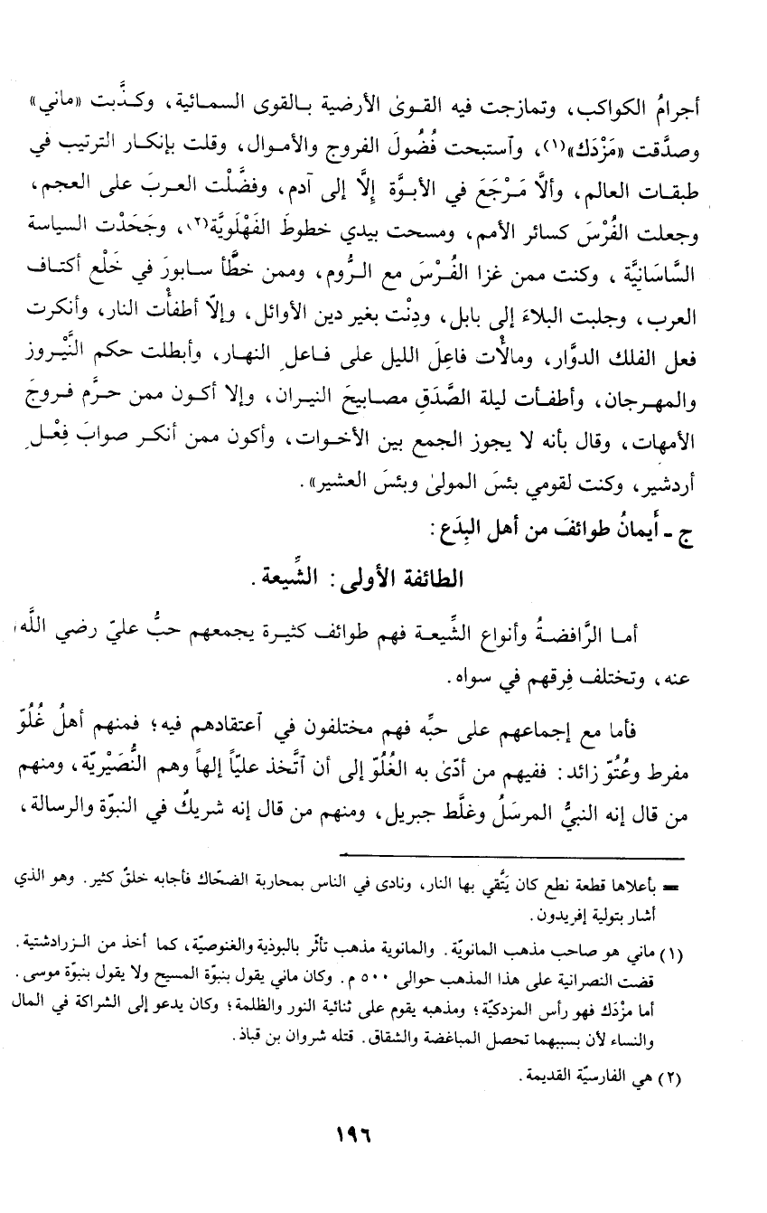 أجرام الكواكب، وتمازجت فيه القوى الأرضية بالقوى السمائية، وكذبت (ماني) وصدقت (مزدك)، واستبحت فضول الفروج والأموال، وقلت بإنكار الترتيب في طبقات العالم، وألا مرجع في الأبوة إلا إلى آدم، وفضلت العرب على العجم، وجعلت الفرس كسائر الأمم، ومسحت بيدي خطوط الفهلوية، وجحدت السياسة الساسانية، وكنت ممن غزا الفرس مع الروم، وممن خطأ سابور في خلع أكتاف العرب، وجلبت البلاء إلى بابل، ودنت بغير دين الأوائل، وإلا أطفأت النار، وأنكرت فعل الفلك الدوار، ومالأت فاعل الليل على فاعل النهار، وأبطلت حكم النيروز والمهرجان، وأطفأت ليلة الصدق مصابيح النيران، وإلا أكون ممن حرم الأمهات، وقال إنه لا يجوز الجمع بين الأخوات، وأكون ممن أنكر صواب فعل أردشير، وكنت لقومي بئس المولى وبئس العشير).