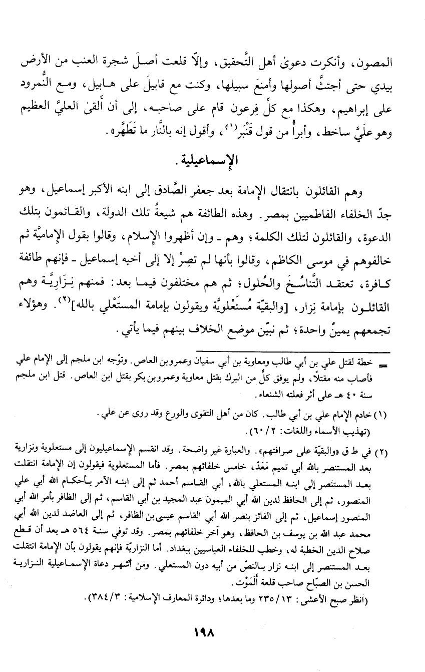 وهم القائلون بانتقال الإمامة بعد جعفر الصادق إلى ابنه الأكبر إسماعيل، وهو جد الخلفاء الفاطميين بمصر. وهذه الطائفة هو شيعة تلك الدولة، والقائمون بتلك الدعوة، والقائلون لتلك الكلمة؛ وهم - وإن اظهروا الإسلام، وقالوا بقول الإمامية ثم خالفوهم في موسى الكاظم، وقالوا بأنها لم تصر إلا إلى أخيه إسماعيل - فإنهم طائفة كافرة، تعتقد التناسخ والحلول؛ ثم هم مختلفون فيما بعد: فمنهم نزارية وهم القائلون بإمامة نزار، والبقية