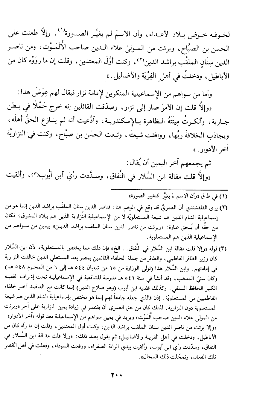 لخوفه خوض بلاد الأعداء، وأن الاسم لم يغير الصورة، وإلا طعنت على الحسن بن الصباح، وبرئت من المولى علاء الدين صاحب الألموت، ومن ناصر الدين سنان الملقب براشد الدين، وكنت أول المعتدين، وقلت إن ما رووه كان من الأباطيل، ودخلت في أهل الفرية والأضاليل.)