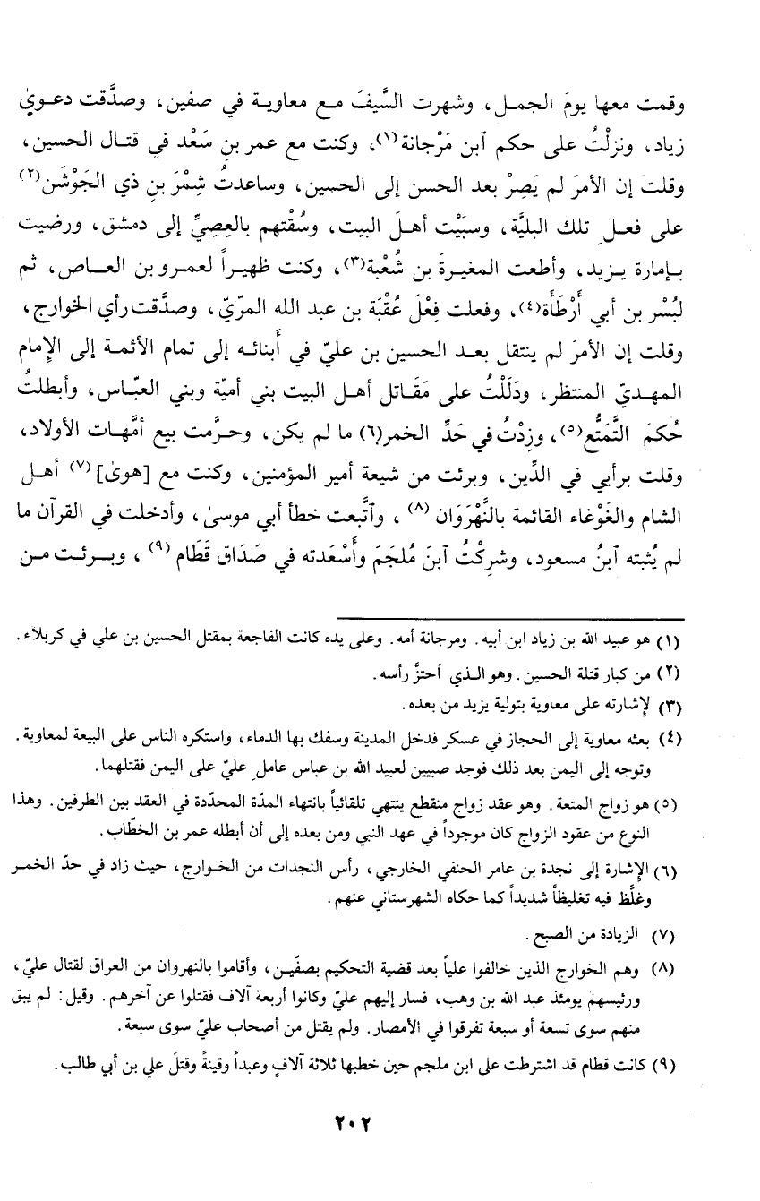 وقمت معها يوم الجمل، وشهرت السيف مع معاوية في صفين، وصدقت دعوى زياد، ونزلت على حكم ابن مرجانة، وكنت مع عمر بن سعد في قتال الحسين، وقلت إن الأمر لم يصر بعد الحسن إلى الحسين، وساعدت شمر بن ذي الجوشن على فعل تلك البلية، وسبيت أهل البيت، وسقتهم بالعصي إلى دمشق، ورضيت بإمارة يزيد، وأطعت المغيرة بن شعبة، وكنت ظهيرا لعمرو بن العاص، ثم لبسر بن أبي أرطأة، وفعلت فعل عقبة بن عبد الله المري، وصدقت رأي الخوارج، وقلت إن الأمر لم ينتقل بعد الحسين بن علي في أبنائه إلى تمام الأئمة إلى الإمام المهدي المنتظر، ودللت على مقاتل أهل البيت بني أمية وبني العباس، وأبطلت حكم التمتع، وزدت في حد الخمر ما لم يكن، وحرمت بيع أمهات الأولاد، وقلت برأيي في الدين، وبرئت من شيعة أمير المؤمنين، وكنت مع هوى أهل الشام والغوغاء القائمة بالنهروان، واتبعت خطأ أبي موسى، وأدخلت في القرآن ما لم يثبته ابن مسعود، وشركت ابن ملجم وأسعدته في صداق قطام، وبرئت من