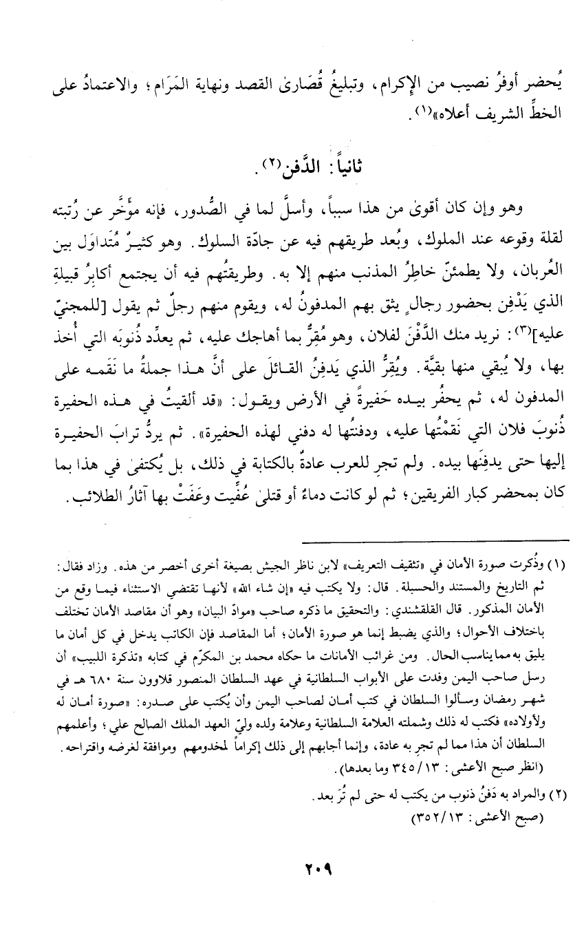 عند الملوك، وبعد طريقهم فيه عن جادة السلوك. وهو كثير متداول بين العربان، ولا يطمئن خاطر المذنب منهم إلا به. وطريقتهم فيه أن يجتمع أكابر قبيلة الذي يدفن بحضور رجال يثق بهم المدفون له، ويقوم منهم رجل ثم يقول للمجني عليه: نريد منك الدفن لفلان، وهو مقر بما أهاجك عليه، ثم يعدد ذنوبه التي أخذ بها، ولا يبقي منها بقية. ويقر الذي يدفن القائل على أن هذا جملة ما نقمه على المدفون له، ثم يحفر بيده حفيرة في الأرض ويقول: (قد ألقيت في هذه الحفيرة ذنوب فلان التي نقمتها عليه، ودفنتها له دفني لهذه الحفيرة). ثم يرد تراب الحفيرة إليها حتى يدفنها بيده. ولم تجر للعرب عادة بالكتابة في ذلك، بل يكتفى في هذا بما كان بمحضر كبار الفريقين؛ ثم لو كانت دماء أو قتلى عفيت وعفت بها آثار الطلائب.