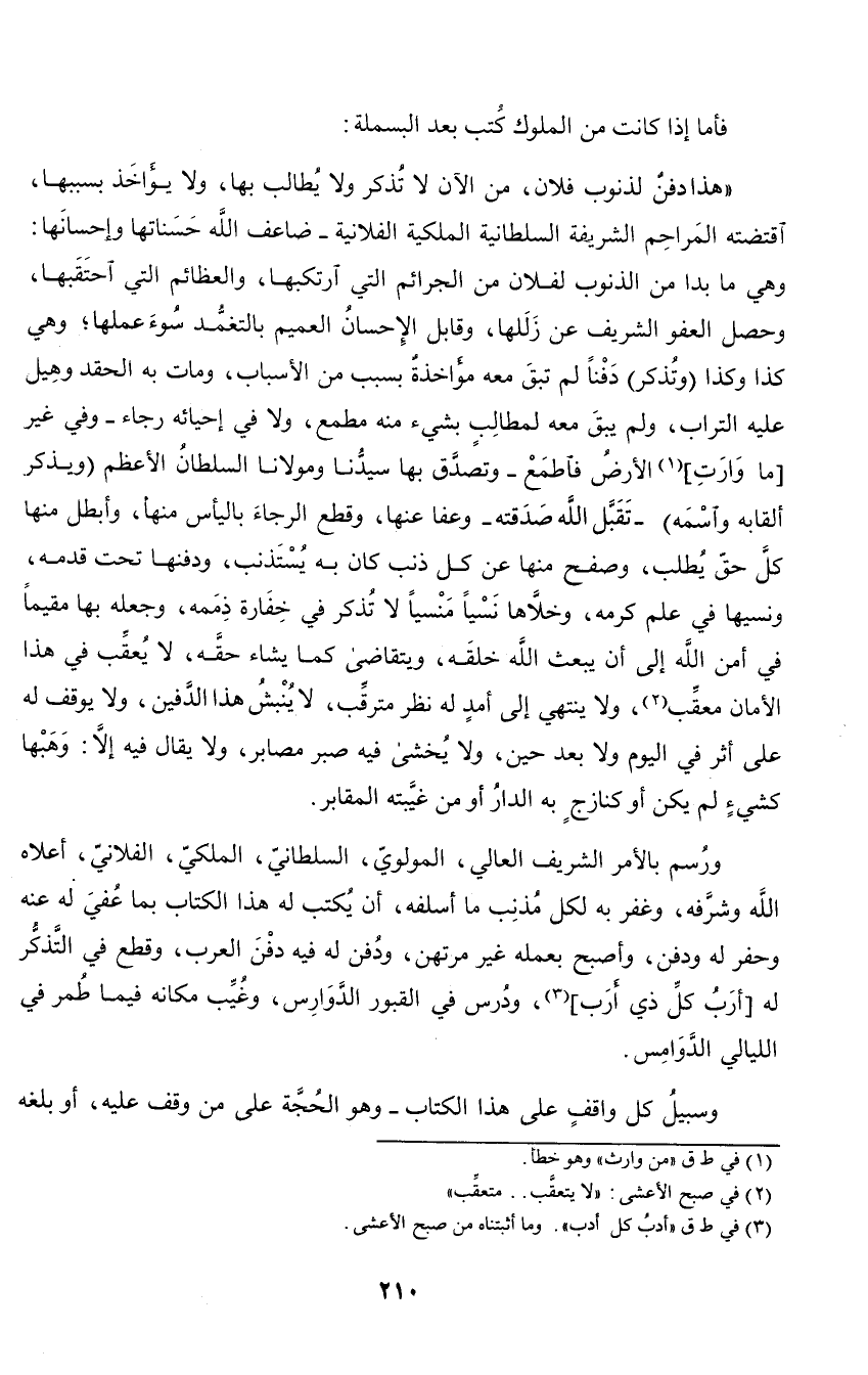 ورسم بالأمر الشريف العالي، المولوي، السلطاني، الملكي، الفلاني، أعلاه الله وشرفه، وغفر به لكل مذنب ما أسلفه، أن يكتب له هذا الكتاب بما عفي له عنه وحفر له ودفن،