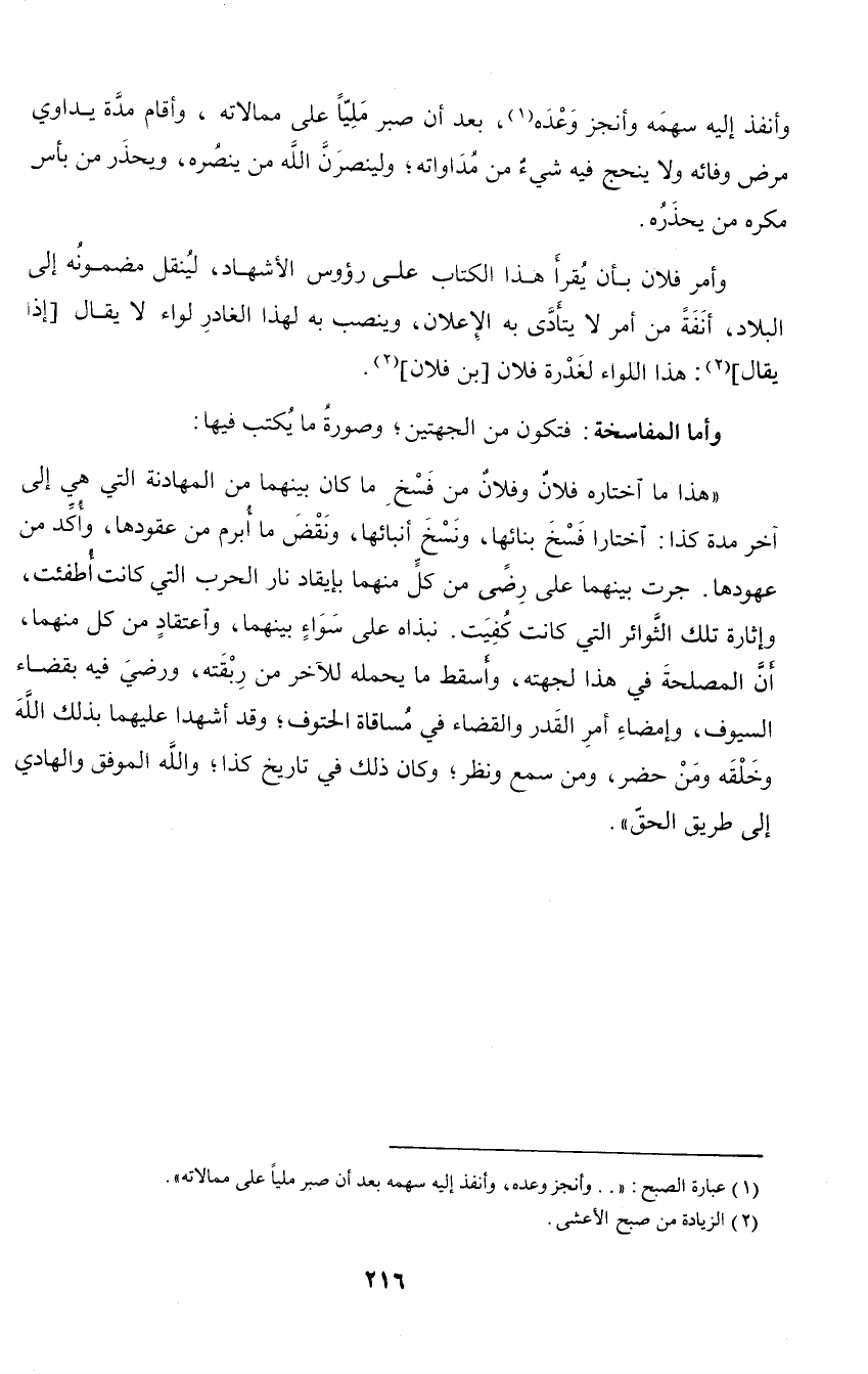 (هذا ما اختاره فلان وفلان من فسخ ما كان بينهما من المهادنة التي هي إلى آخر مدة كذا: اختارا فسخ بنائها، ونسخ أنبائها، ونقض ما أبرم من عقودها، وأكد من عهودها. جرت بينهما على رضى من كل منهما بإيقاد نار الحرب التي كانت أطفئت، وإثارة تلك الثوائر التي كانت كفيت. نبذاه على سواء بينهما، واعتقاد من كل منهما، أن المصلحة في هذا لجهته، وأسقط ما يحمله للآخر من ربقته، ورضي فيه بقضاء السيوف، وإمضاء أمر القدر والقضاء في مساقاة الحوف؛ وقد أشهدا عليهما بذلك الله وخلقه ومن حضر، ومن سمع ونظر؛ وكان ذلك في تاريخ كذا؛ والله الموفق والهادي إلى طريق الحق).