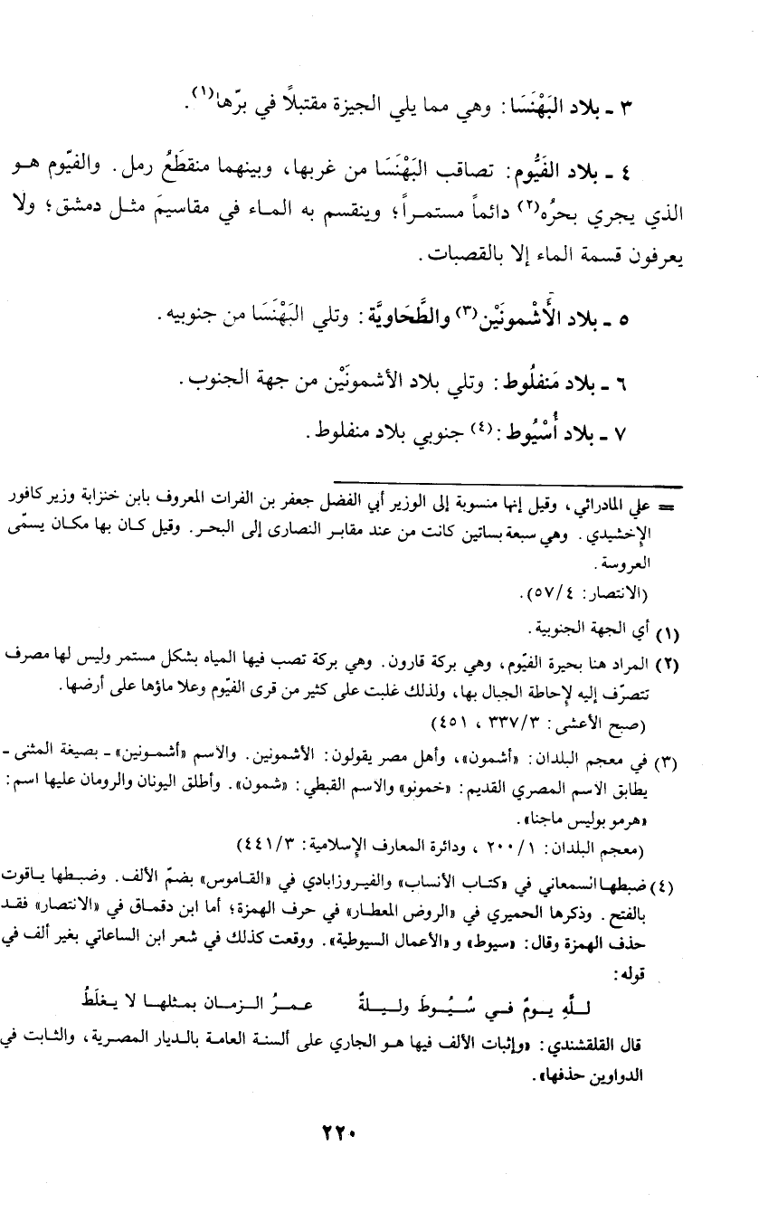 4 - بلاد الفيوم: تصاقب البهنسا من غربها، وبينهما منقطع رمل. والفيوم هو الذي يجري بحره دائما مستمرا؛ وينقسم به الماء في مقاسيم مثل دمشق؛ ولا يعرفون قسمة الماء إلا بالقصبات.
