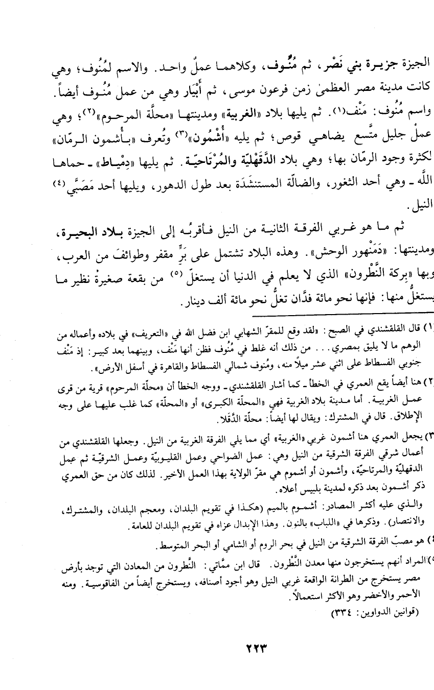 ثم ما هو غربي الفرقة الثانية من النيل فأقربه إلى الجيزة بلاد البحيرة، ومدينتها (دمنهور الوحش). وهذه البلاد تشتمل على بر مقفر وطوائف من العرب، وبها (بركة النطرون) الذي لا يعلم في الدنيا أن يستغل من بقعة صغيرة نظير ما يستغل منها: فإنها نحو مائة فدان تغل نحو مائة ألف دينار.