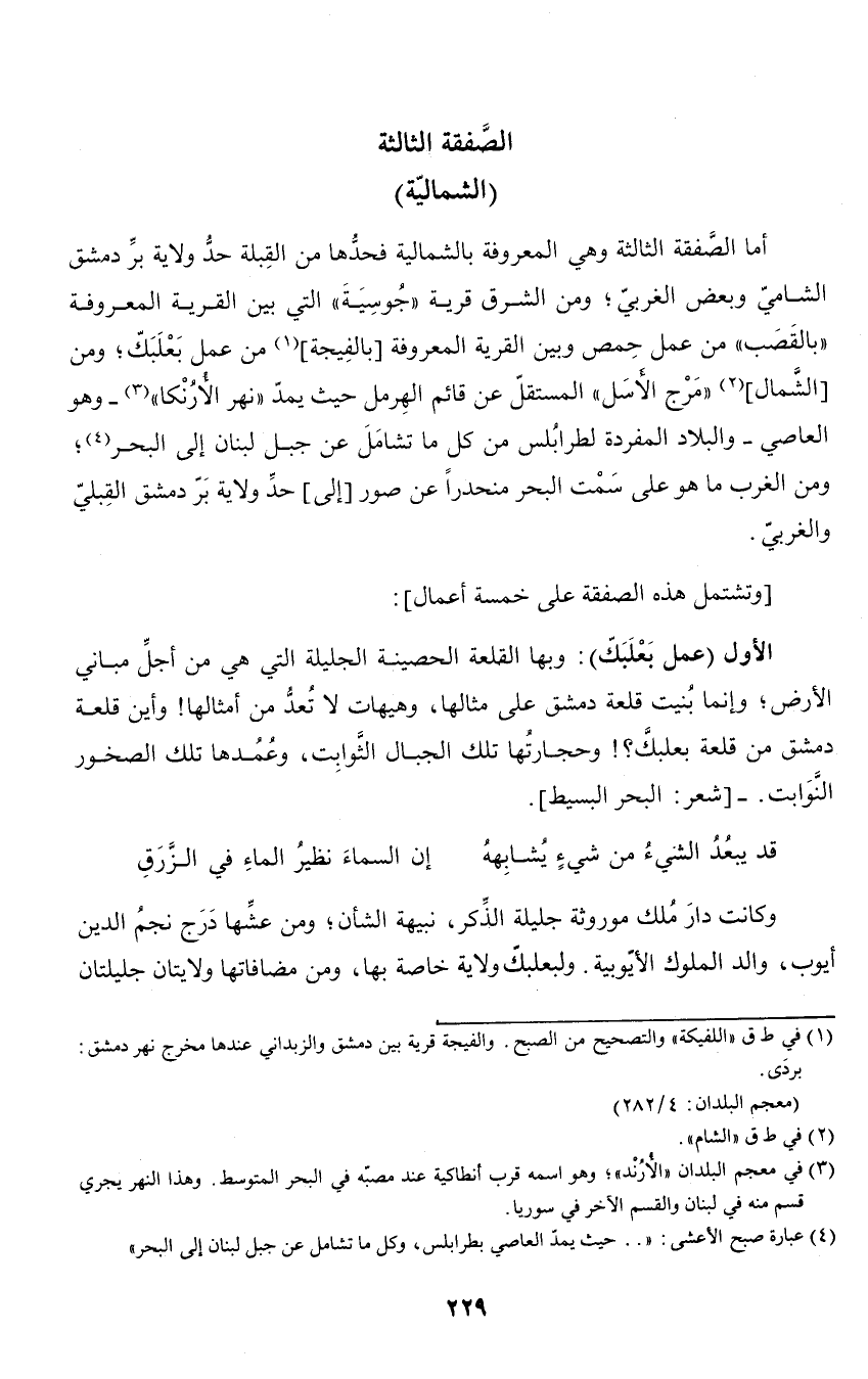 الأول: (عمل بعلبك): وبها القلعة الحصينة الجليلة التي هي من أجل مباني الأرض؛ وغنما بنيت قلعة دمشق على مثالها، وهيهات لا تعد من أمثالها! وأين قلعة دمشق من قلعة بعلبك؟! وحجارتها تلك الجبال الثوابت، وعمدها تلك الصخور النوابت: