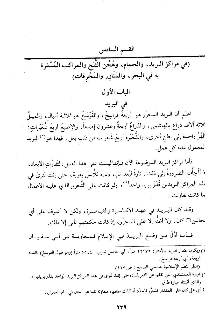 اعلم أن البريد المحرر هو أربعة فراسخ، والفرسخ هو ثلاثة أميال، والميل ثلاثة آلاف ذراع بالهاشمي، والذراع أربعة وعشون إصبعا، والإصبع أربعة شعيرات: ظهر واحدة إلى بطن أخرى، والشعيرة أربع شعرات من ذنب بغل. فهذا هو البريد المعمول عليه كل عمل.