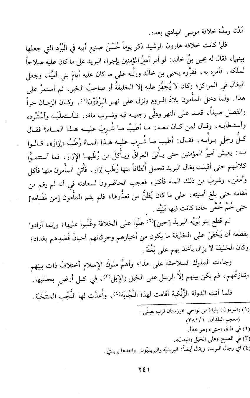 فلما كانت خلافة هارون الرشيد ذكر يوما حسن صنيع أبيه في البرد التي جعلها بينهما، فقال له يحيى بن خالد: لو أمر أمير المؤمنين بإجراء البريد على ما كان عليه صلاحا لملكه، فأمره به، فقرره يحيى بن خالد ورتبه على ما كان عليه أيام بني أمية، وجعل البغال في المراكز؛ وكان لا يجهز عليه إلا الخليفة أو صاحب الخبر، ثم استمر على هذا. ولما دخل المأمون بلاد الروم ونزل على نهر البرذون، وكان الزمان حرا والفصل صيفا، قعد على النهر ودلى رجليه فيه وشرب ماءه، فاستعذبه واستبرده واستطابه، وقال لمن كان معه: ما أطيب ما شرب عليه هذا الماء؟ فقال كل رجل برأيه، فقال: أطيب ما شرب عليه هذا الماء رطب (إزاز)، قالوا له: يعيش أمير المؤمنين حتى يأتي العراق ويأكل من رطبها الإزاز، فما استتموا كلامهم حتى أقبلت بغال البريد تحمل ألطافا منها رطب إزاز، فأتي المأمون منها فأكل وأمعن، وشرب من ذلك الماء فأكثر، فعجب الحاضرون لسعادته في أنه لم يقم من مقامه حتى بلغ أمنيته، على ما كان يظن من تعذرها؛ فلم يقم المأمون من مقامه حتى حم حمى حادة كانت فيها منيته.