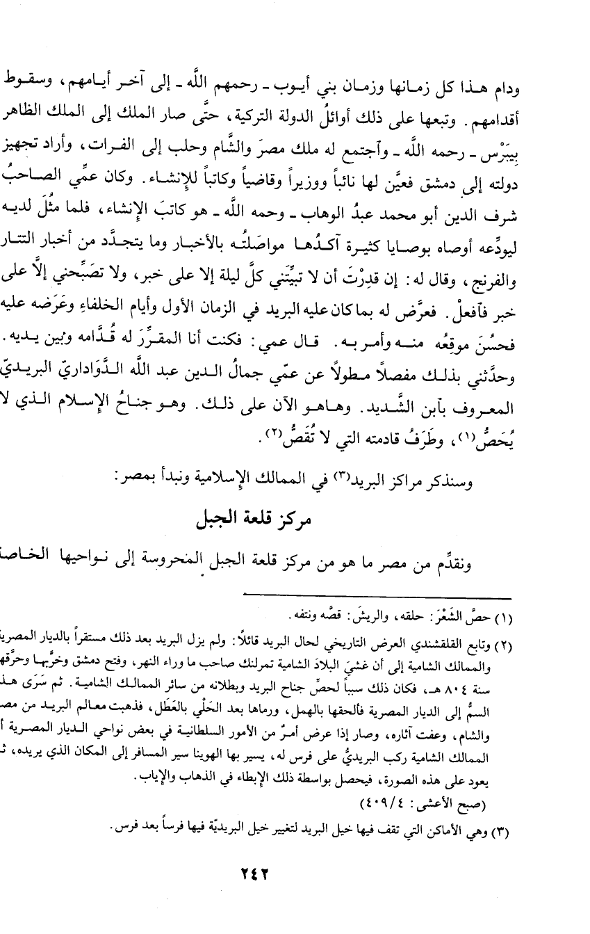 ودام هذا كل زمانها وزمان بني أيوب - رحمهم الله - إلى آخر أيامهم، وسقوط أقدامهم. وتبعها على ذلك أوائل الدولة التركية، حتى صار الملك إلى الملك الظاهر بيبرس - رحمه الله - واجتمع له ملك مصر والشام وحلب إلى الفرات، وأراد تجهيز دولته إلى دمشق فعين لها نائبا ووزيرا وقاضيا وكاتبا للإنشاء. وكان عمي الصاحب شرف الدين أبو محمد عبد الوهاب - رحمه الله - هو كاتب الإنشاء، فلما مثل لديه ليودعه أوصاه بوصايا كثيرة آكدها مواصلته بالأخبار وما يتجدد من أخبار التتار والفرنج، وقال له: إن قدرت أن لا تبيتني كل ليلة إلا على خبر، ولا تصبحني إلا على خبر فأفعل. فعرض له بما كان عليه البريد في الزمان الأول وأيام الخلفاء وعرضه عليه فحسن موقعه منه وأمر به. قال عمي: فكنت أنا المقرر له قدامه وبين يديه. وحدثني بذلك مفصلا مطولا عن عمي جمال الدين عبد الله الدواداري البريدي المعروف بابن الشديد. وها هو الان على ذلك. وهو جناح الإسلام الذي لا يحصن، وطرف قادمته التي لا تقص.